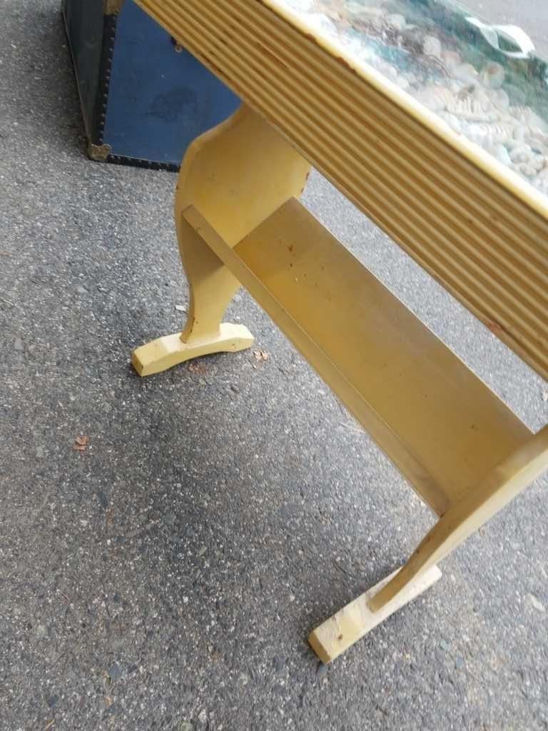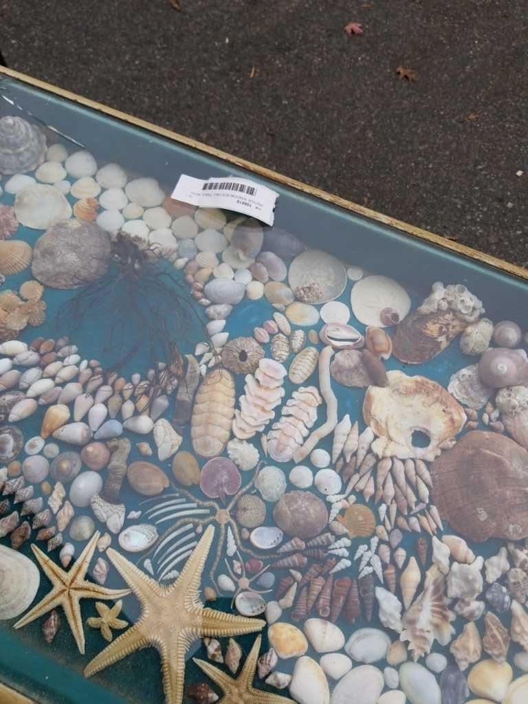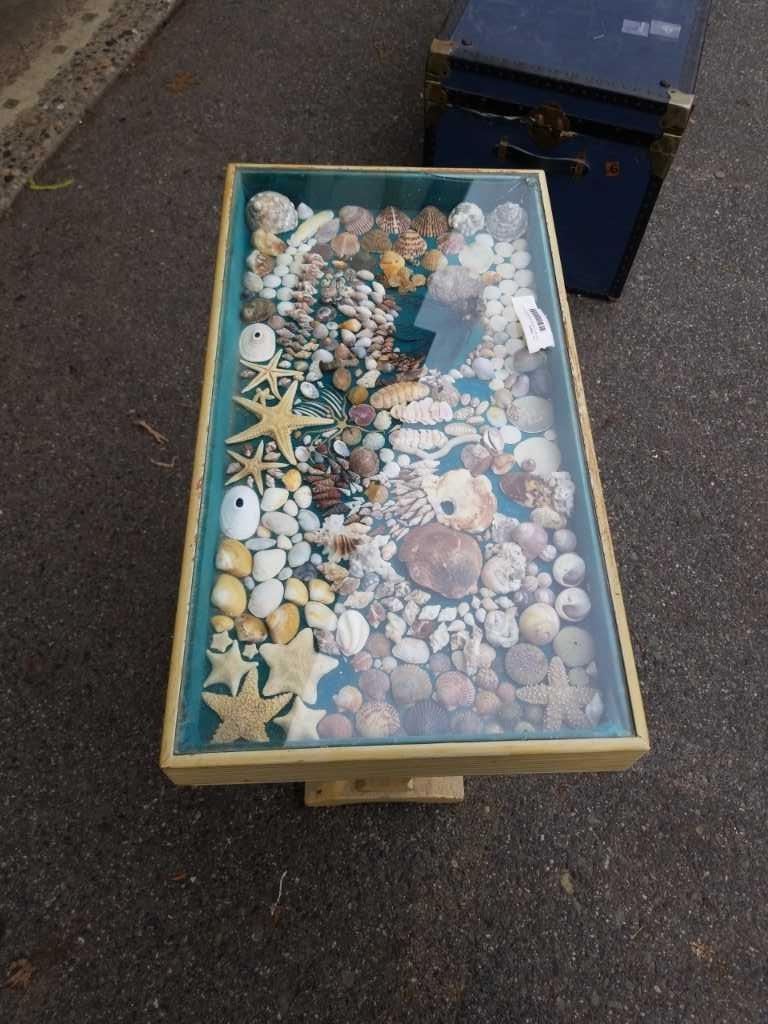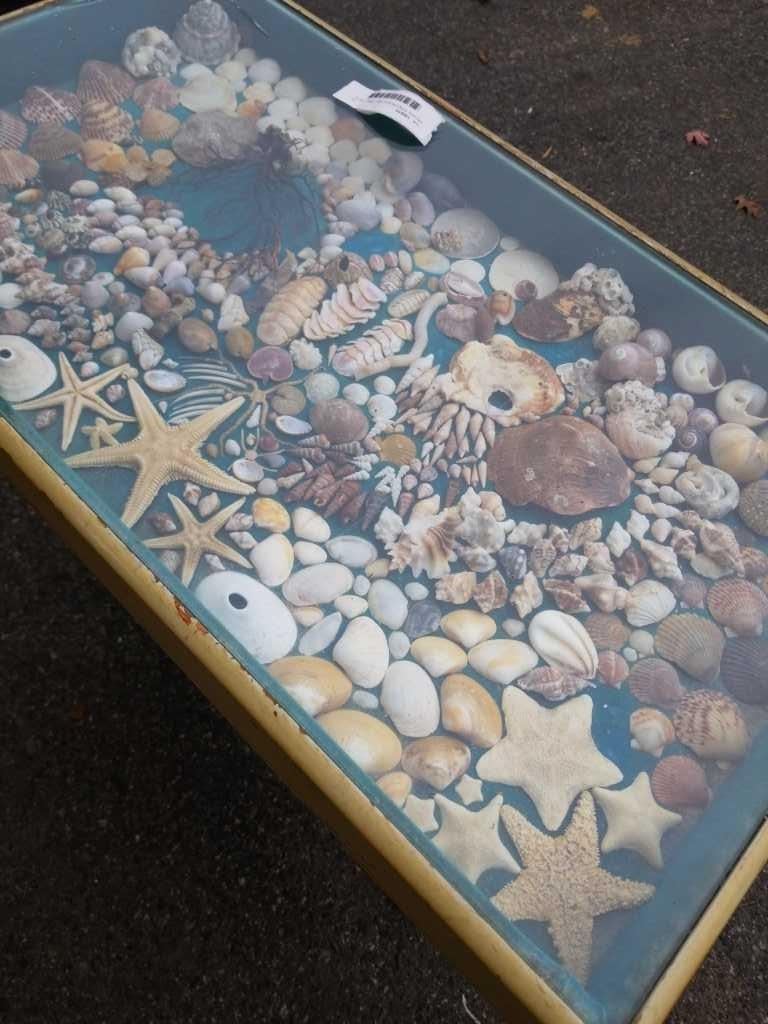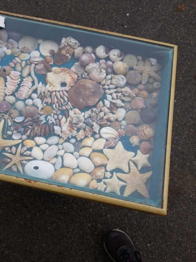 VINTAGE SHADOW BOX HALL TABLE, WITH SHELL DECOR, GLASS NEEDS TO BE REPLACED