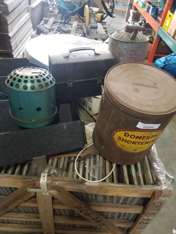 VINTAGE SHORTENING TIN, COLEMAN HEATER, CAN AND ALADDIN LUNCHBOX