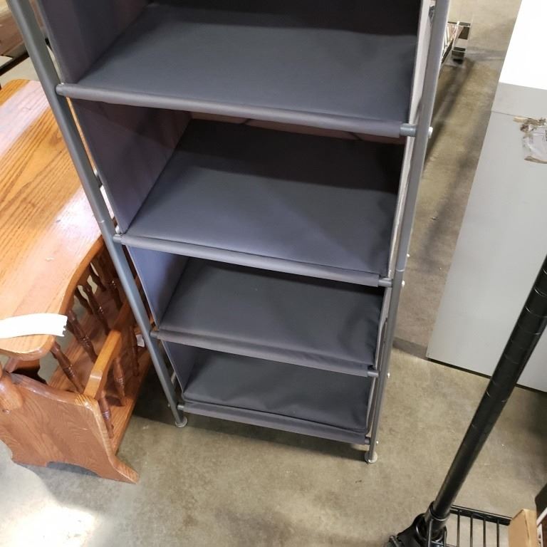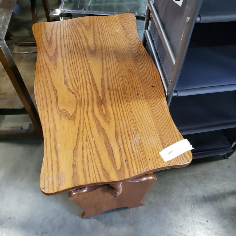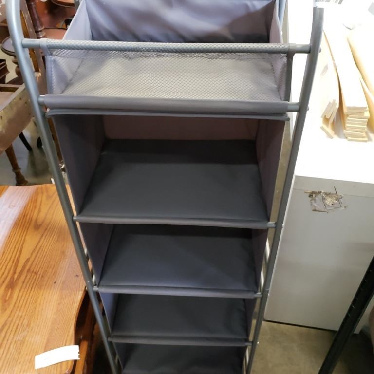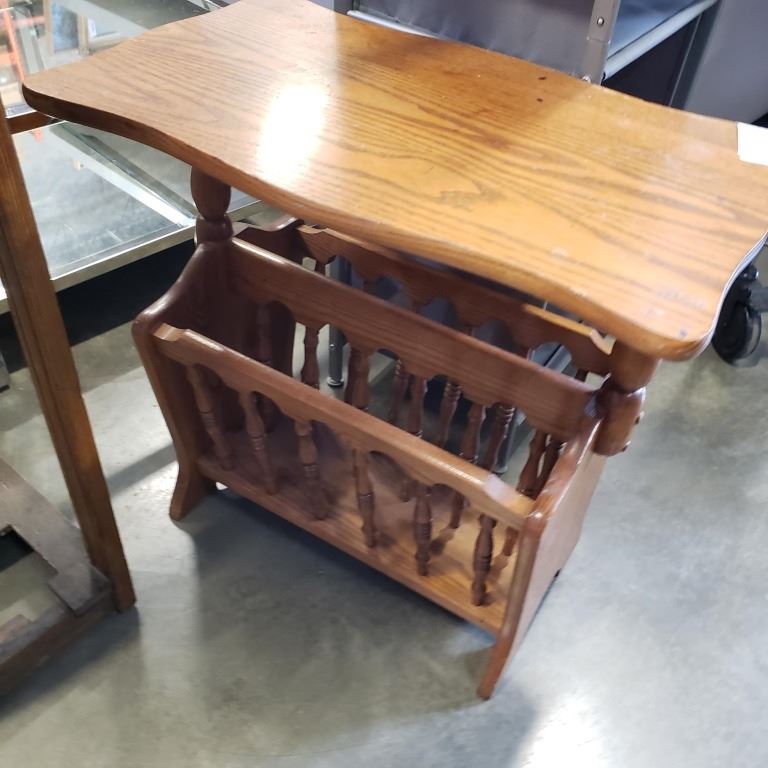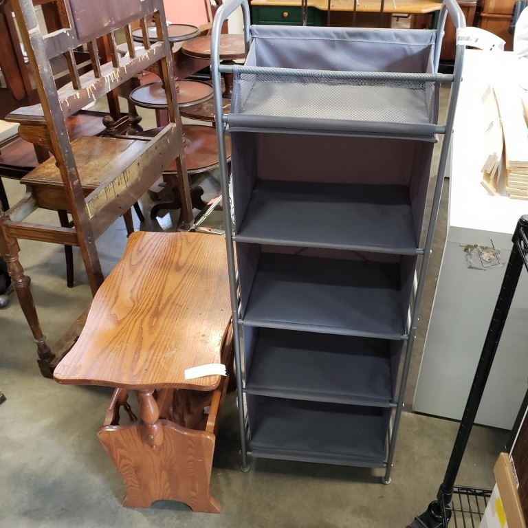 VINTAGE SIDE TABLE WITH RECORD RACK AND FABRIC SHELVING UNIT