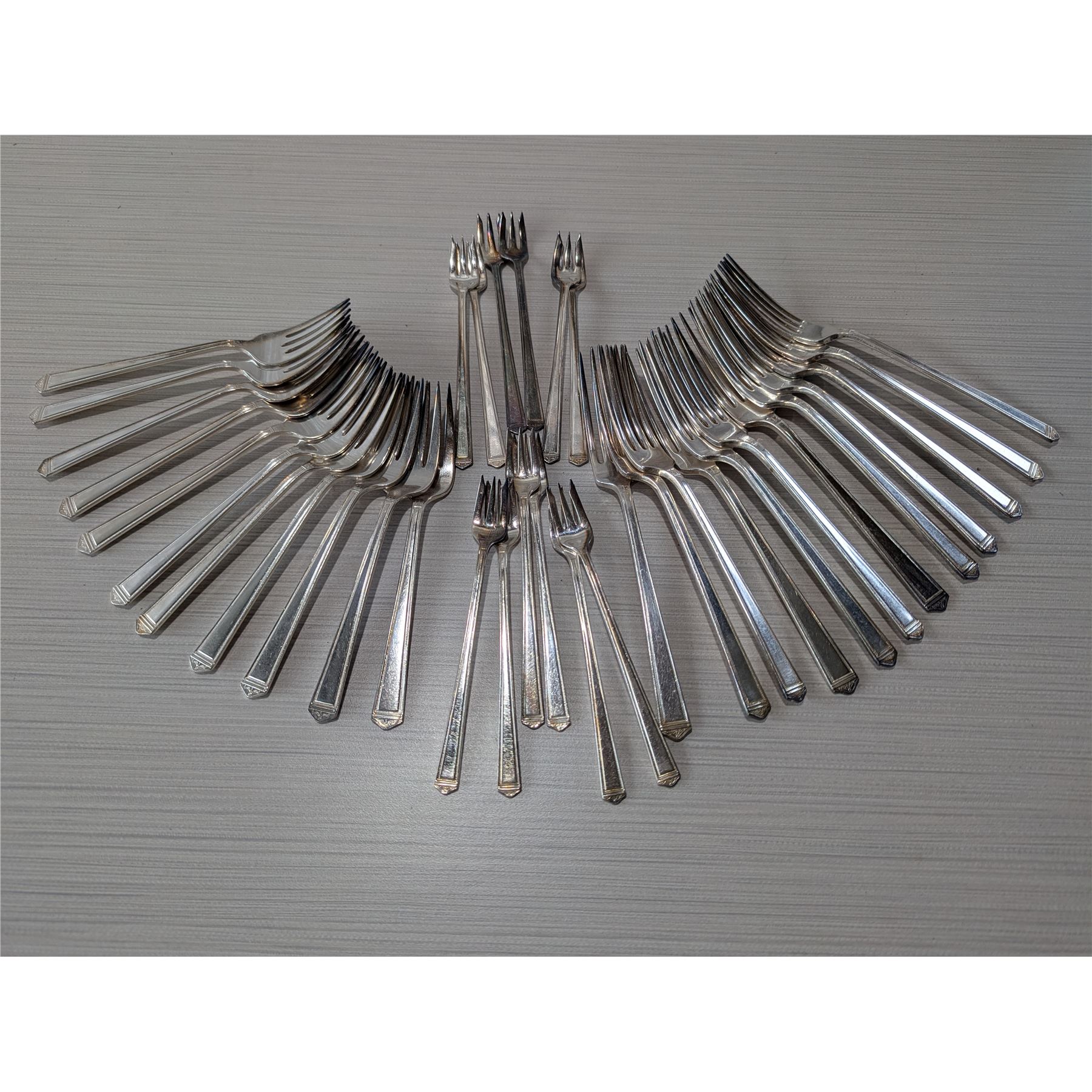 Silverplate flatware, specifically a spoon or ladle, manufactured by 1847 Rogers Bros. 12 large forks, 12 pie forks & 12 pickle forks