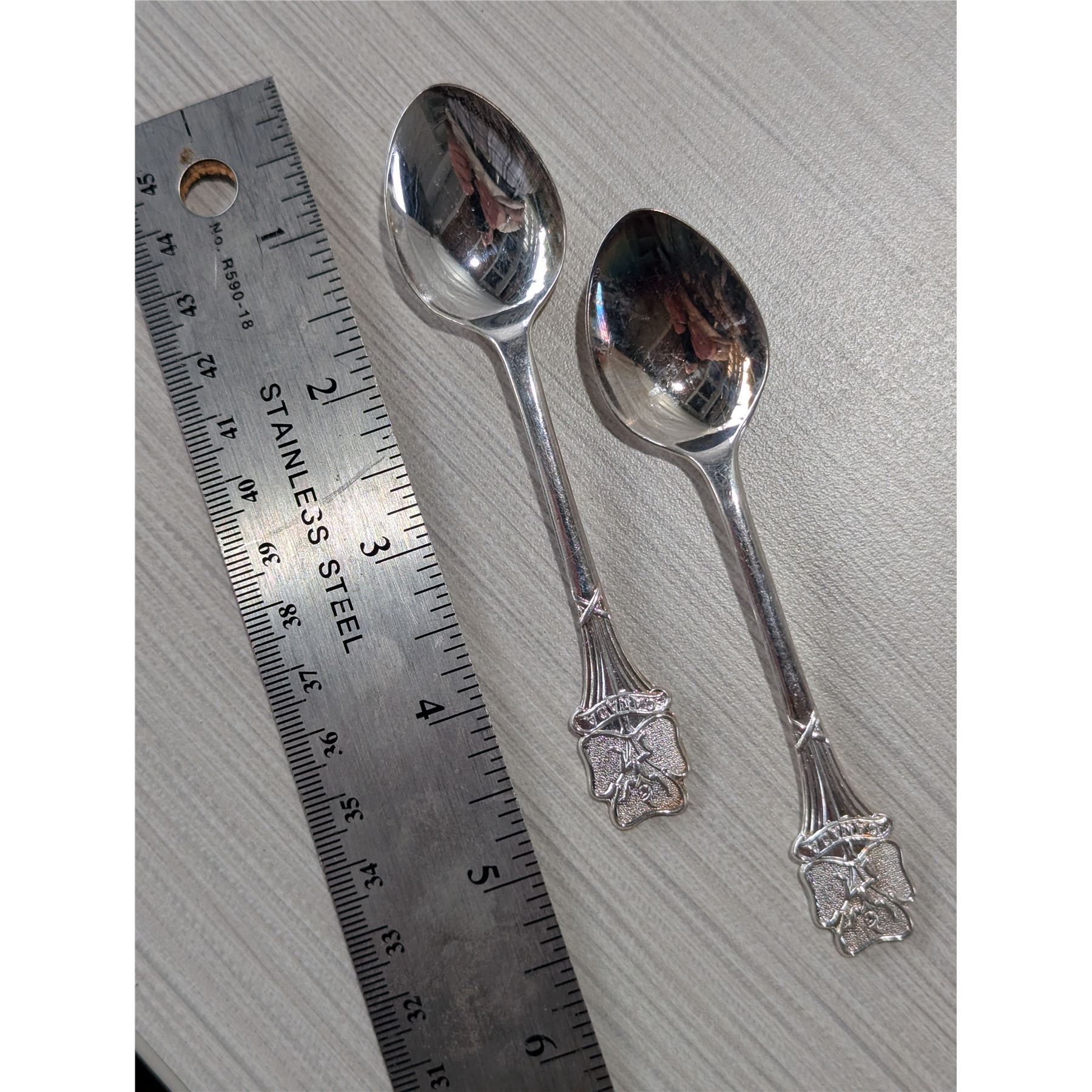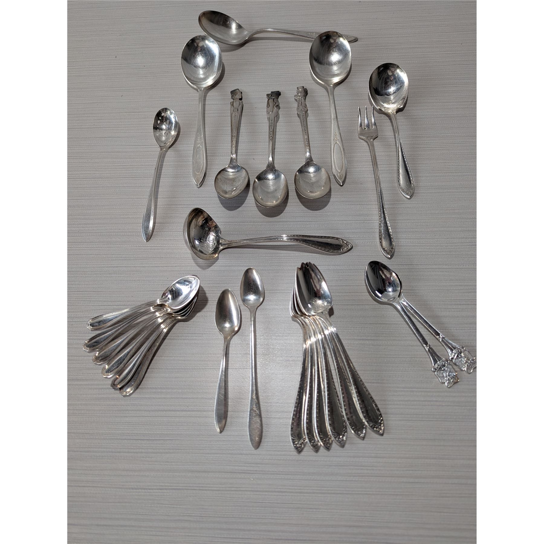 VINTAGE SILVERPLATE SPOONS (25 spoons total) 2 Canada Girl Guide, 2 Children's Yugi Bear cereal spoons, 1 Charlie McCarthy. Most are antique Oneida Community Plate Sheraton pattern serving spoons, possibly dating back to 1910.The odd ball pickle fork is also in the Oneida Community pattern:)