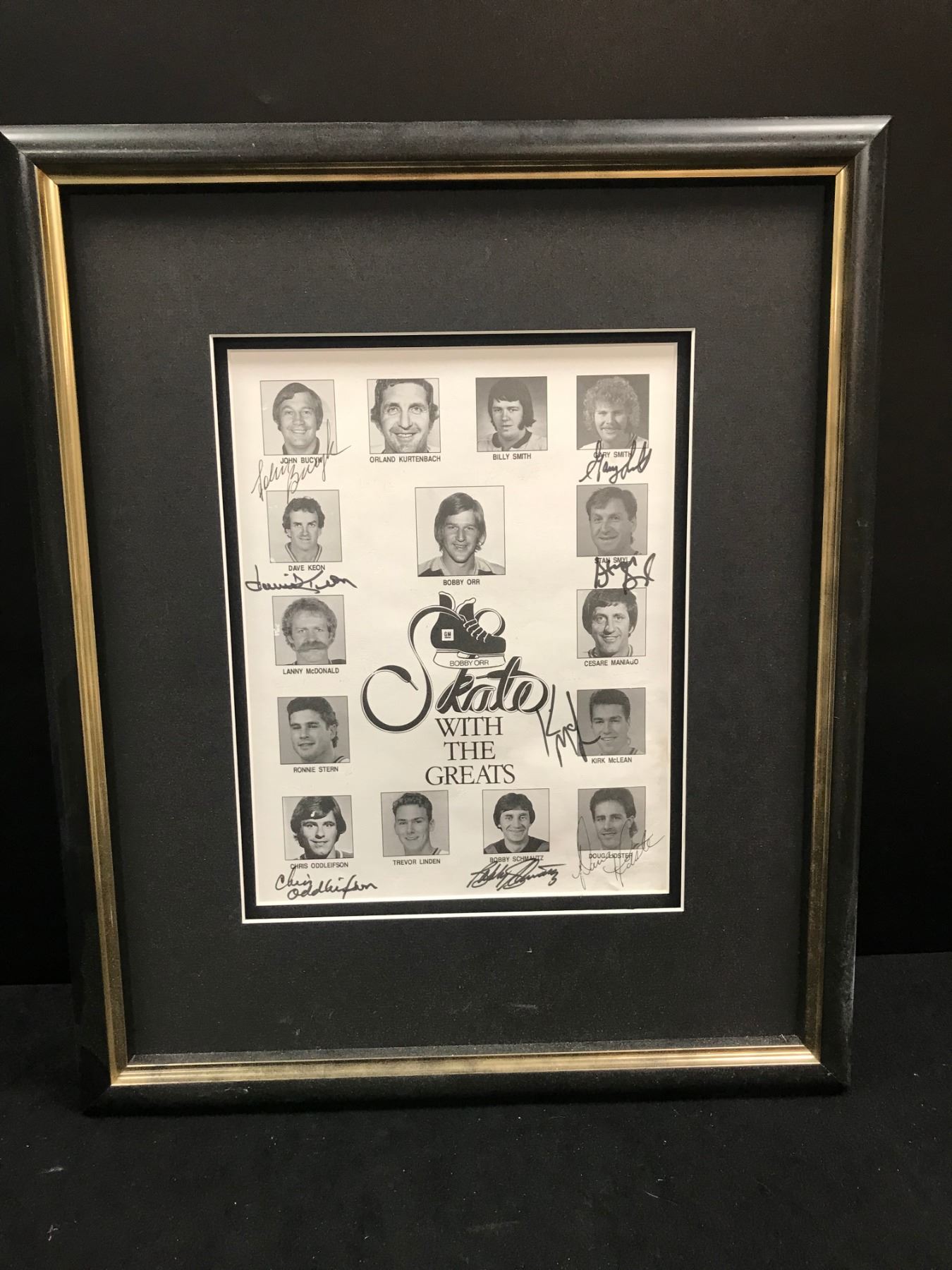 VINTAGE SKATE WITH THE GREAT SIGNED AND FRAMED 8 X 10 (BUCYK, KEON,SMITH, SMYL,MCLEAN...)