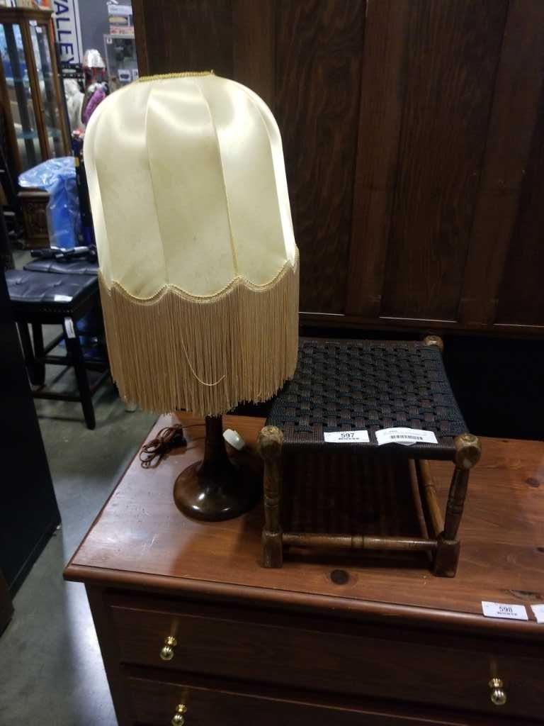 VINTAGE STOOL AND WOODEN BASE LAMP
