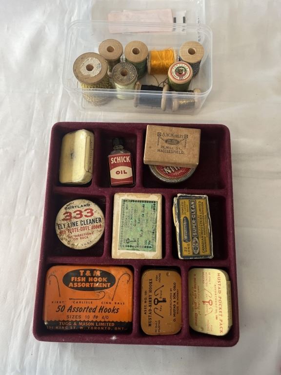 VINTAGE TINS W/ HOOKS, FISHING ACCESSORIES AND WOODEN SPOOLS