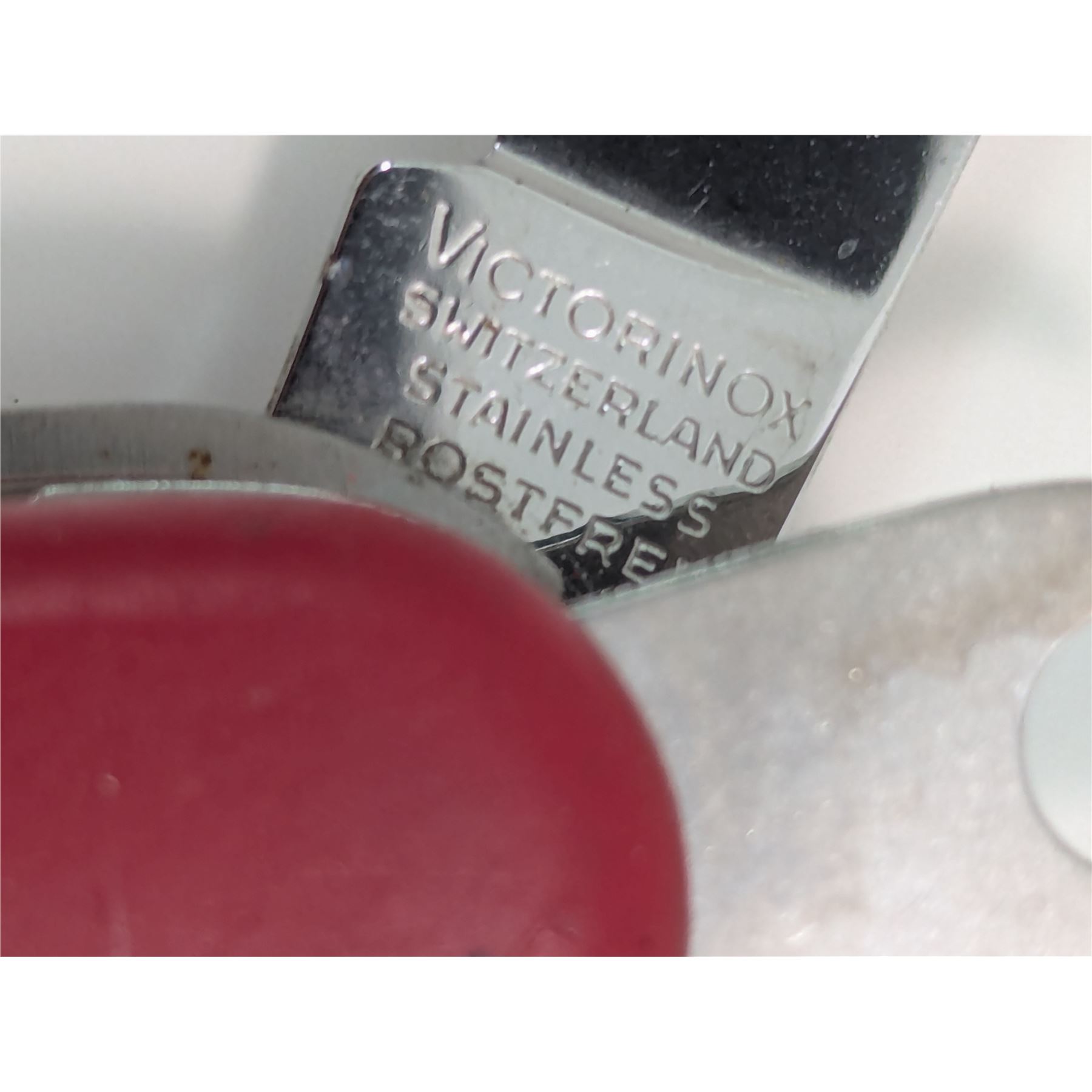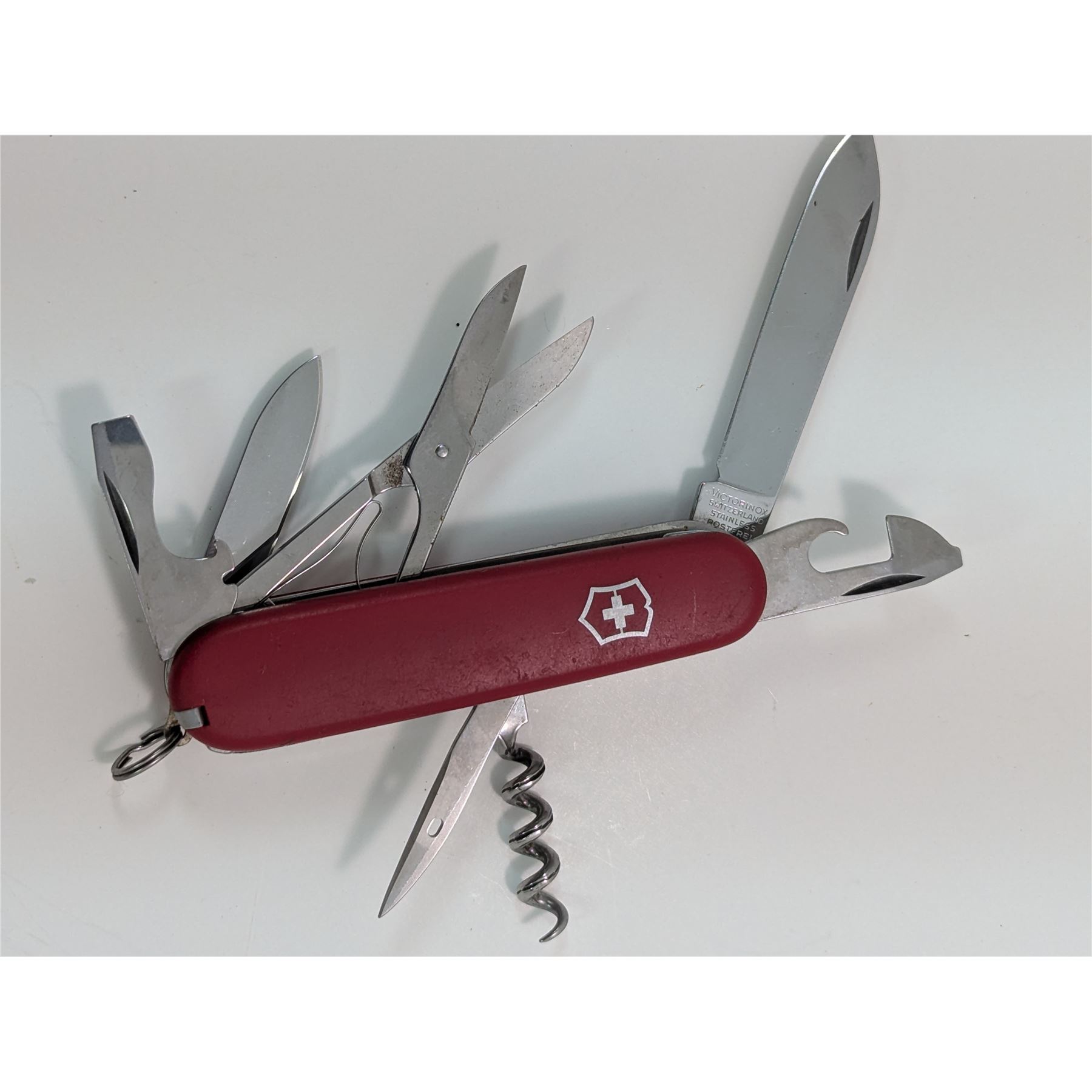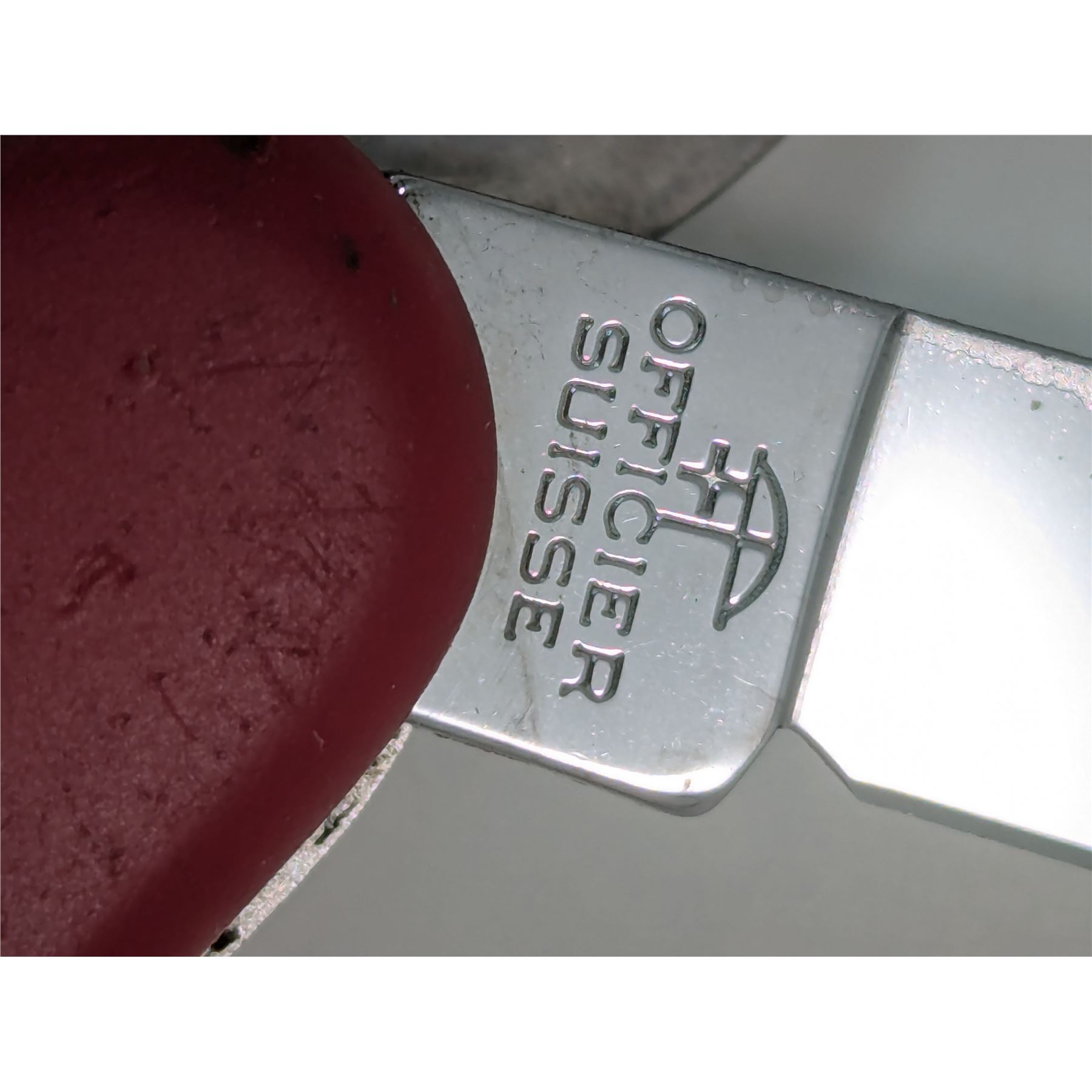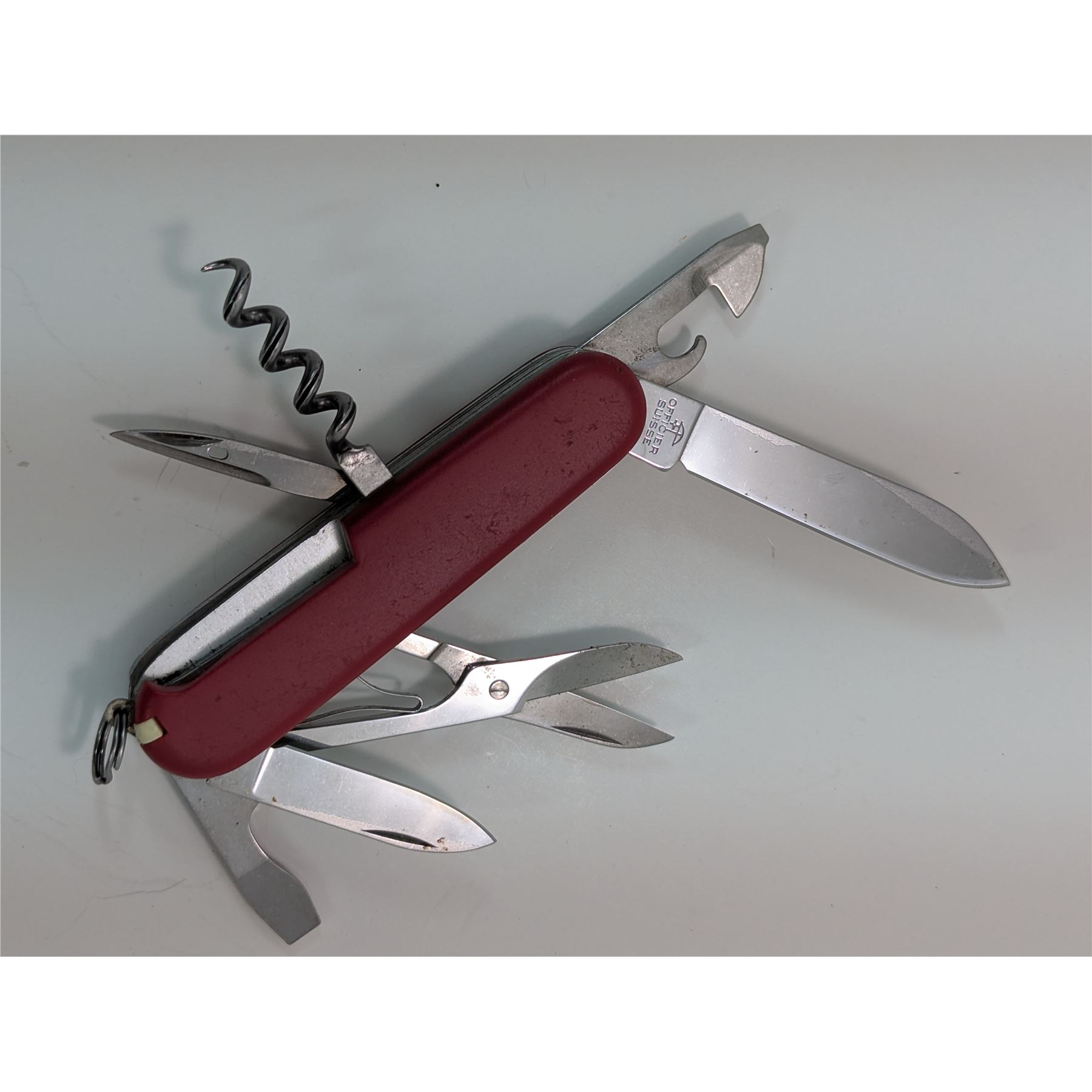 Vintage Victorinox Swiss Army Knife, specifically an "Officier Suisse" model. This type of multi-tool knife was originally patented in 1897 and is known for its versatility and durability.
