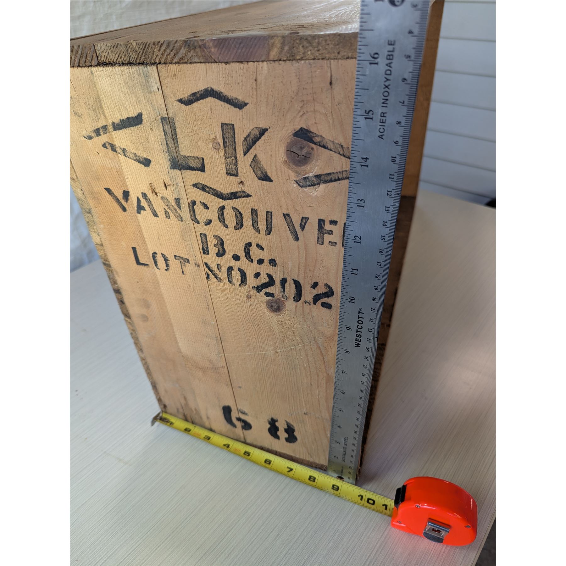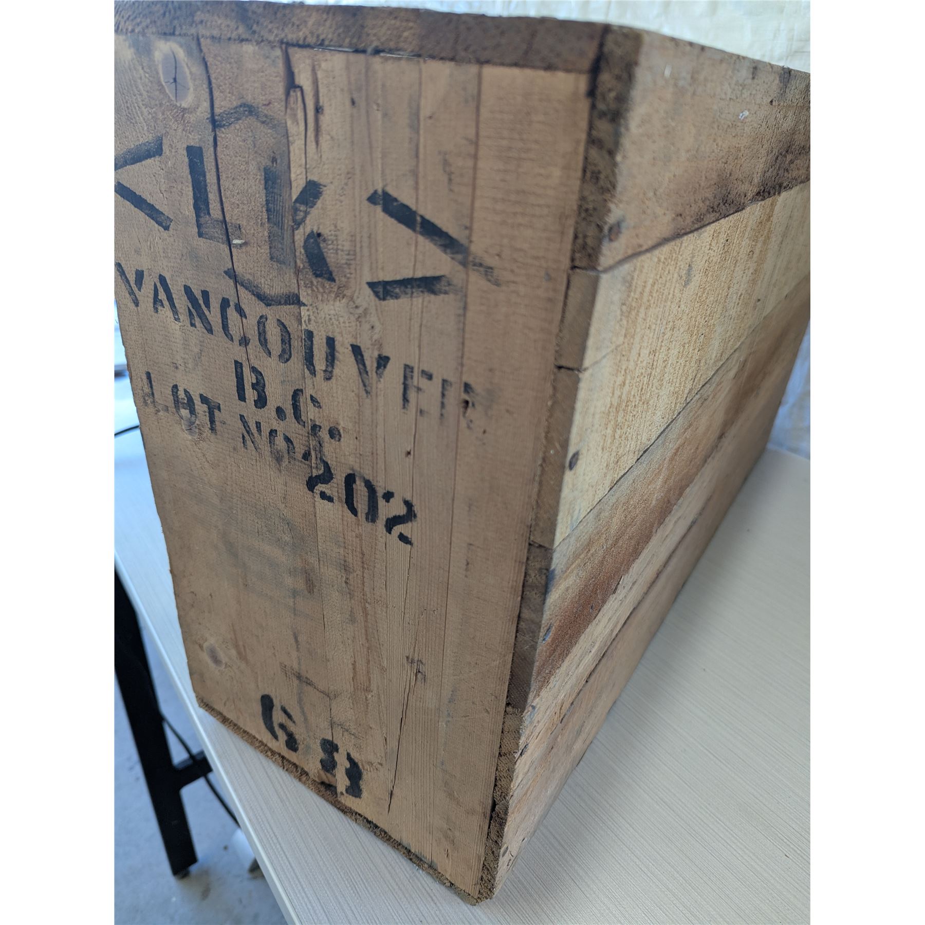 Vintage wooden shipping crate, used for transporting goods from Hong Kong. Measures 27" x 16.25" x 9.5".