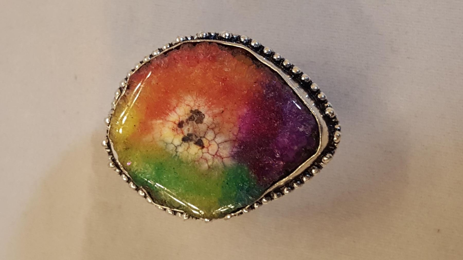 VIVID MULTI COLOR 25 CT DRUZY QUARTZ RING. MOUNTED IN SOLID .925 STERLING SILVER. 14.9 GRAMS. SIZE SIX 8 1/2
