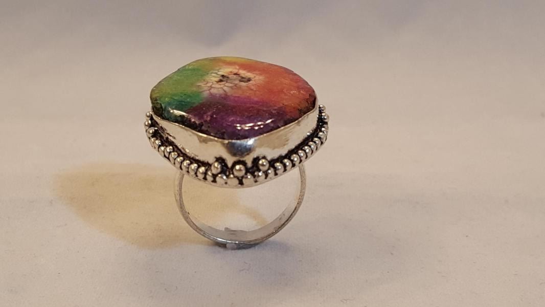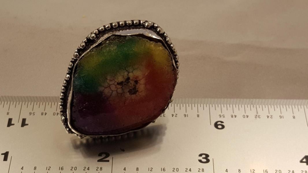 VIVID MULTI COLOR 25 CT DRUZY QUARTZ RING. MOUNTED IN SOLID .925 STERLING SILVER. 14.9 GRAMS. SIZE SIX 8 1/2
