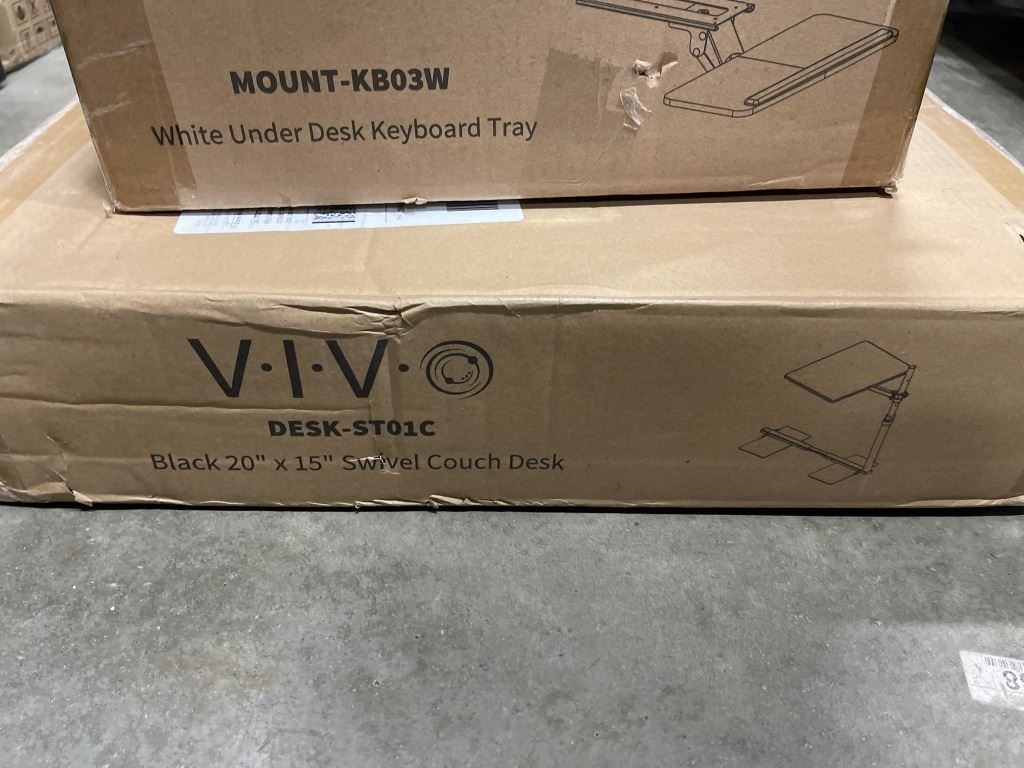 VIVO BLACK SWIVEL COUCH DESK, 20 INCH X 15 INCH, VIVO WHITE LOCKABLE UNDER DESK DRAWER, AND UNDER DE