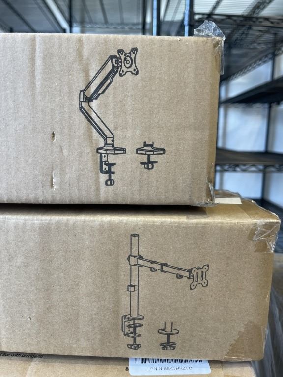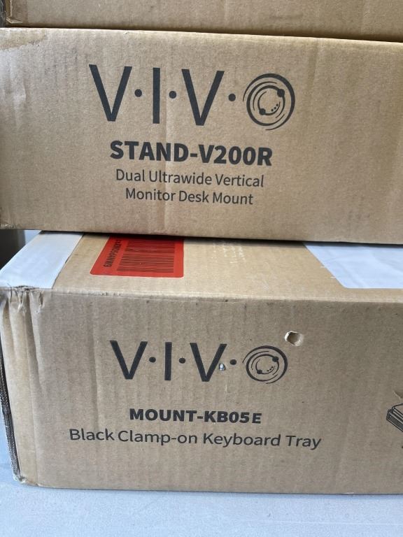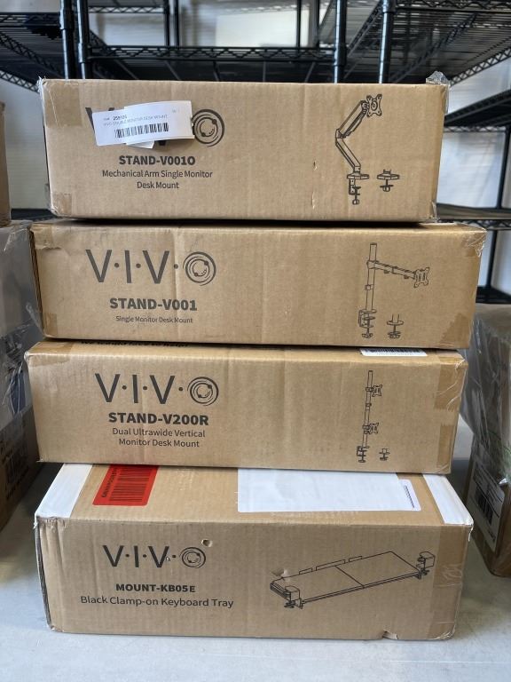 VIVO DOUBLE MONITOR DESK MOUNT, KEYBOARD TRAY AND SINGLE MONITOR DESK MOUNT, AND SINGLE MONITOR ADJUSTABLE DESK MOUNT, 4PC LOT