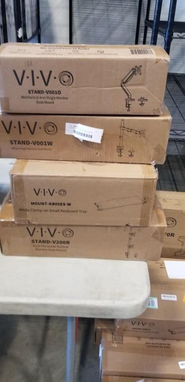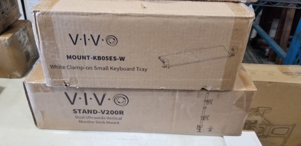 VIVO DOUBLE MONITOR DESK MOUNT, KEYBOARD TRAY AND SINGLE MONITOR DESK MOUNT, AND SINGLE MONITOR ADJUSTABLE DESK MOUNT, 4PC LOT