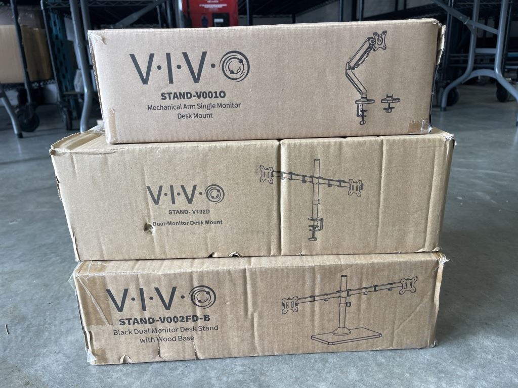 VIVO DUAL MONITOR DESK STAND WITH WOOD BASE, DUAL MONITOR DESK MOUNT, AND VIVO MECHANICAL ARM SINGLE MONITOR DESK MOUNT