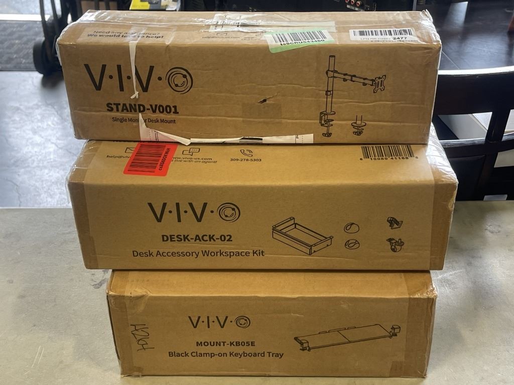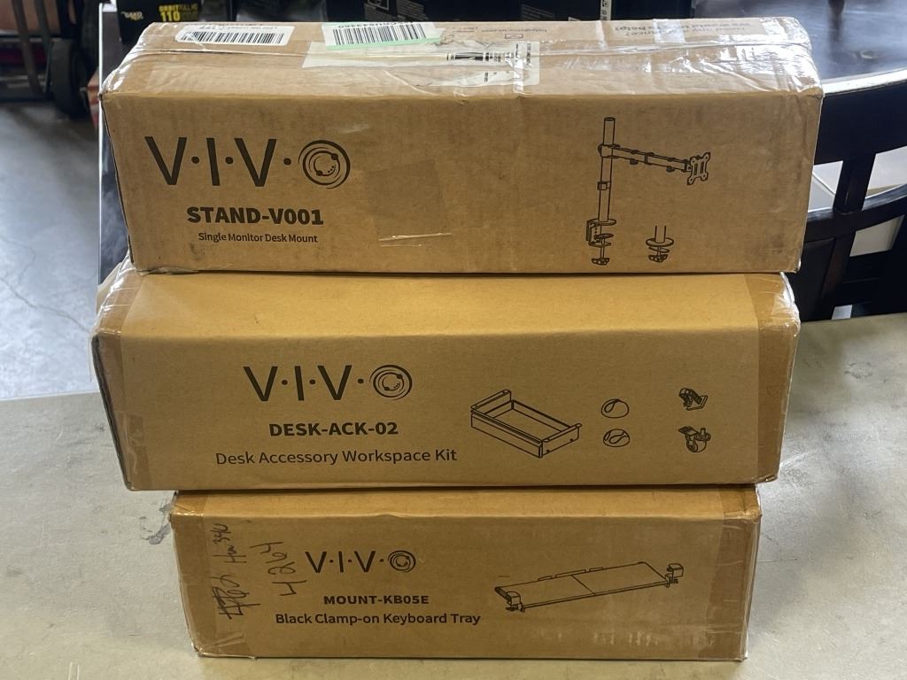 VIVO SINGLE ARM MONITOR DESK MOUNT WITH CLAMP ON KEYBOARD TRAY AND DESK ACCESORY WORKSPACE KIT