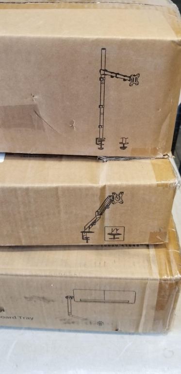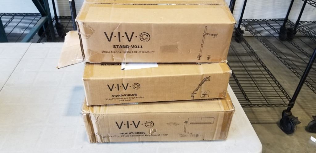 VIVO WHITE PNEUMATIC SINGLE MONITOR DESK MOUNT, SINGLE MONITOR EXTRA TALL DESK MOUNT, AND OFFICE CHAIR MOUNTED KEYBOARD TRAY