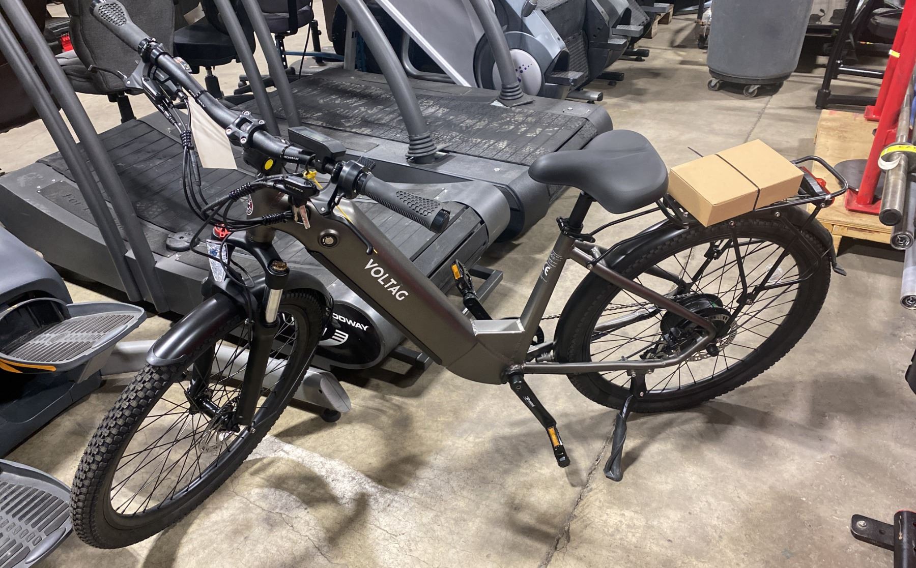 VOLTAG TITANIUM ELECTRIC BIKE WITH CHARGER ( NN-715026MDG ) - 100KM RANGE, HYDRAULIC DISC BRAKES, 9 LEVELS, LCD MULTI FUNCTION DISPLAY, HEADLIGHT + TAILLIGHT, ADJUSTABLE STEM + FRONT SUSPENSION FORK MOTOR: BAFANG G02 48V 500W NOMINAL, 750W PEAK OUTPUT, REAR GEARED HUB MOTOR BATTERY: SAMSUNG 48V 15AH ( 21700 CELLS ) TIRES: KENDA ALL TERRAIN 26" X 2.3" WEIGHT: 55LBS *IN BOX*