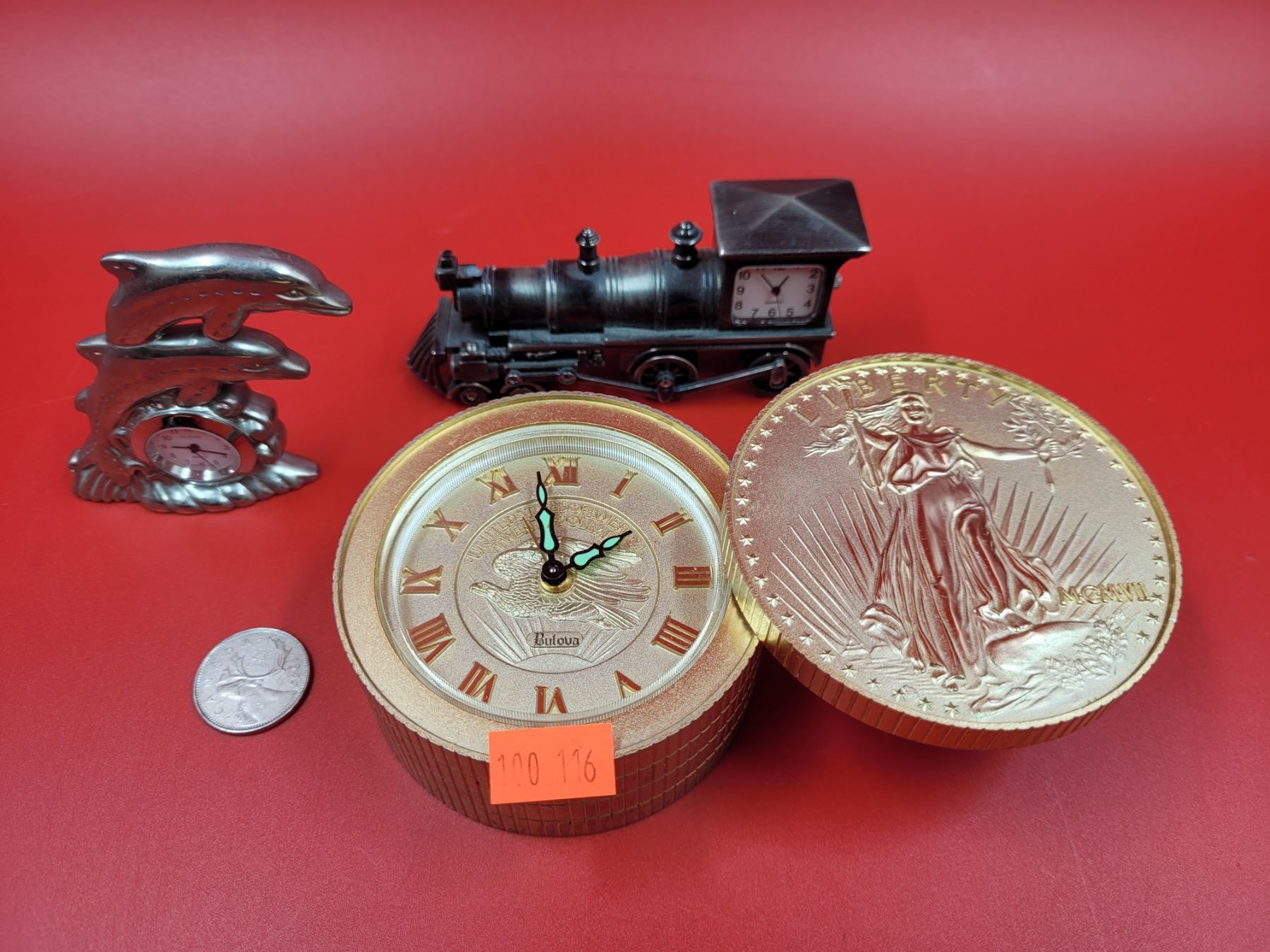VTG Clock Lot w/ Bulova Desk Clock, Train Clock, & Alpine Dolphin Clock