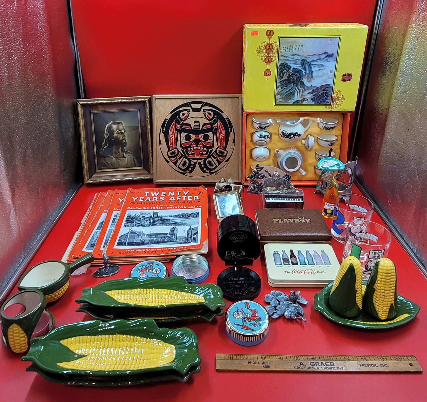 VTG Collectibles Lot w/ Corn Dishes, Asian Tea Set, Coca-Cola Tin, & More