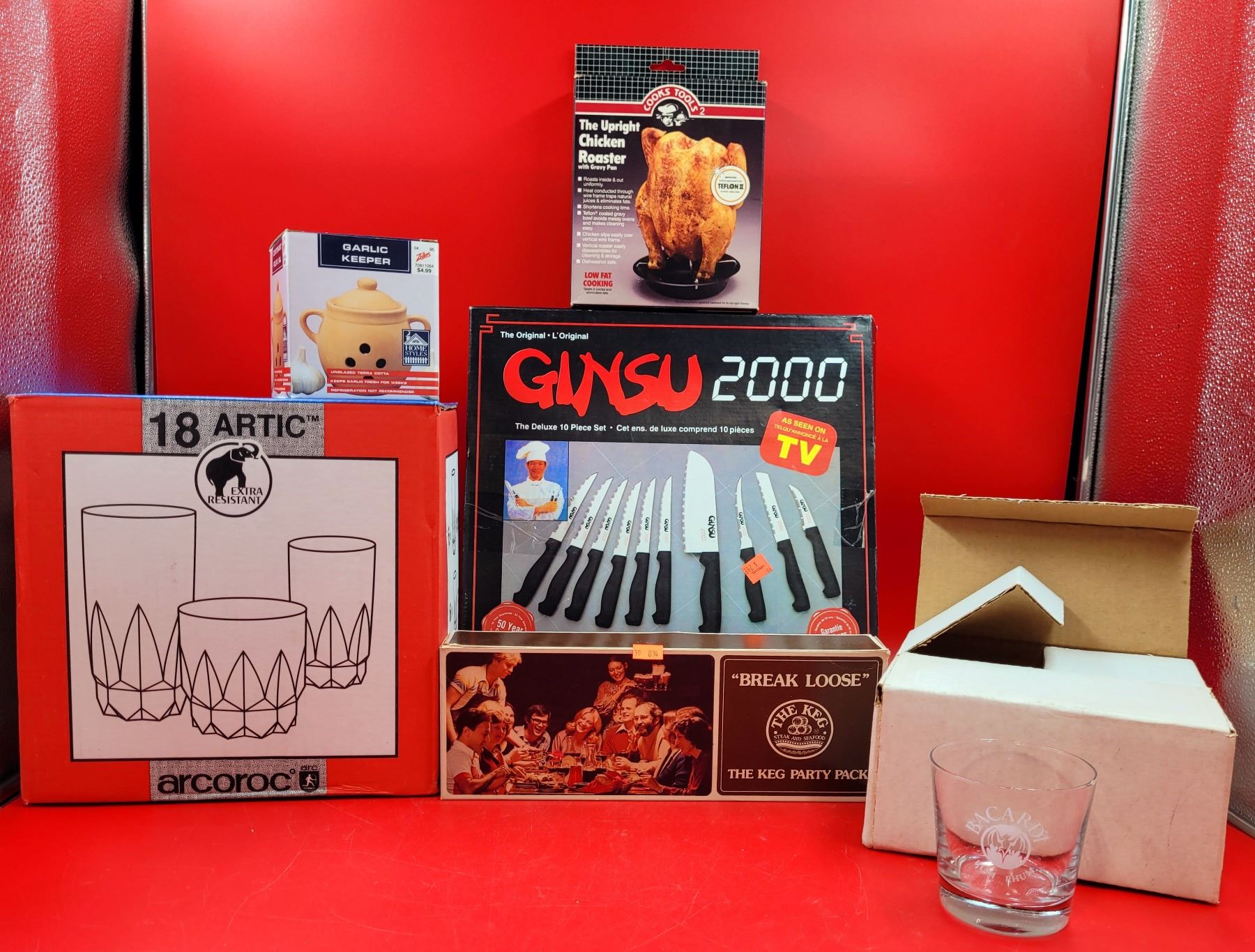 VTG Kitchen Lot w/ Bacardi Glasses, The Keg Glasses, Garlic Keeper, Ginsu Knives, & More