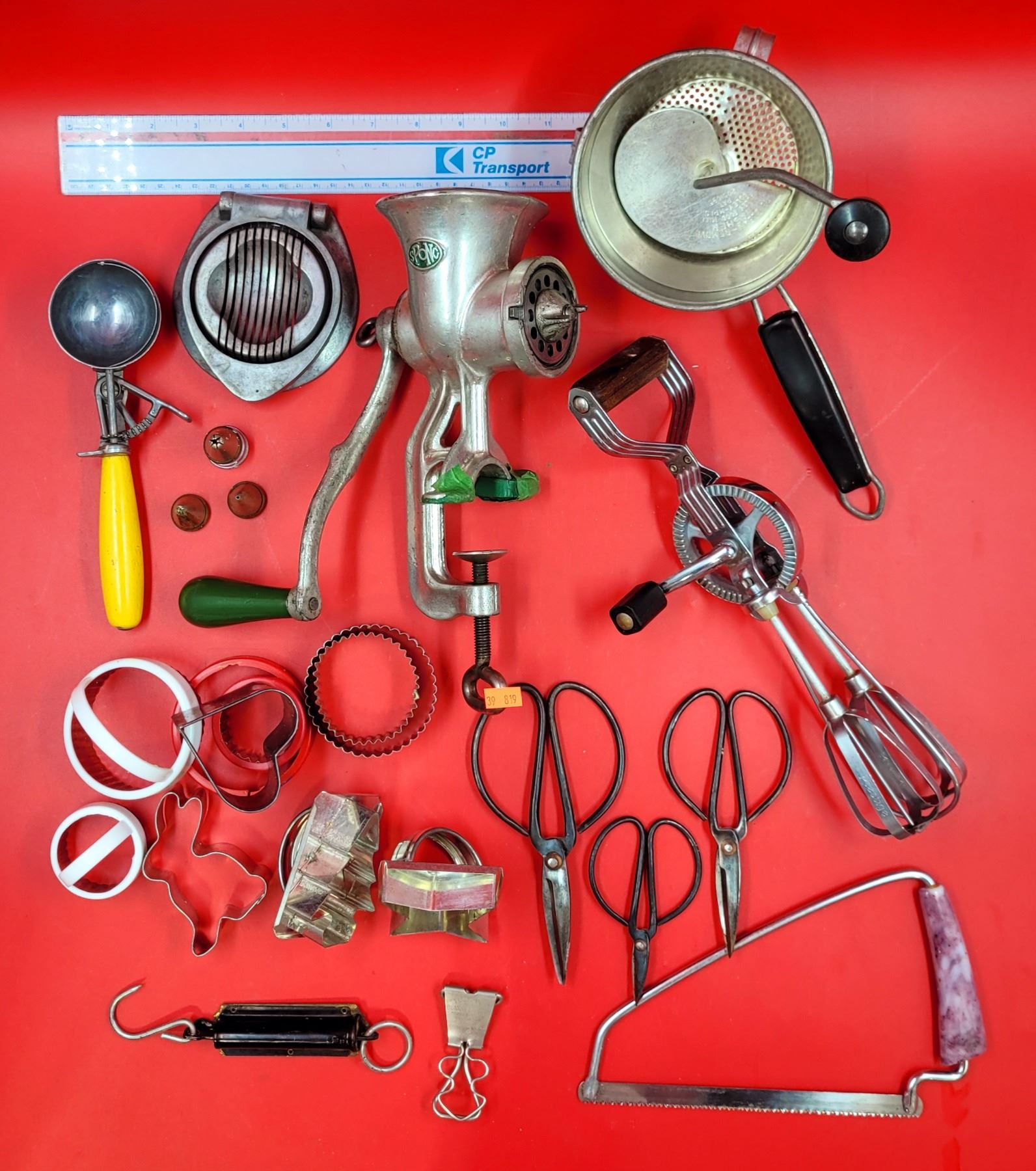 VTG Kitchen Supplies Lot w/ Meat Grinder, Hand Beater, Cookie Cutters, Ice Cream Scoop, & More