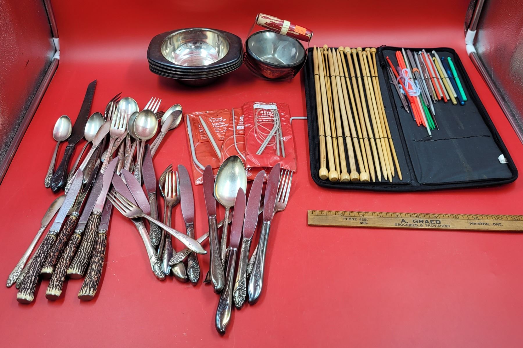VTG Miscellaneous Lot w/ Assorted Cutlery, Knitting Needles, Crochet Needles, & More
