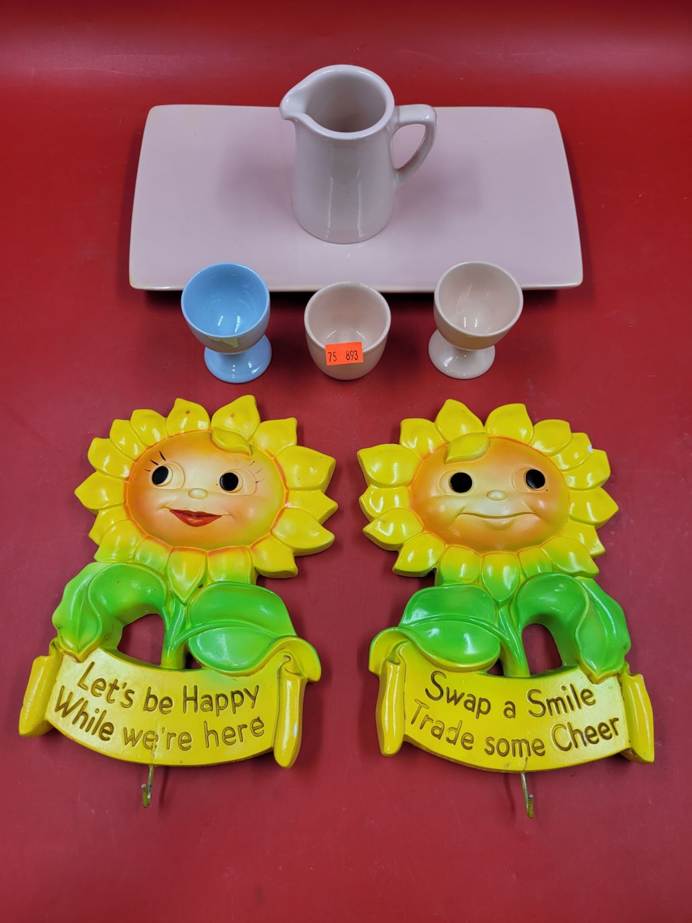 VTG Serve Ware (Platter, Egg Cups, etc.) & 2 Sunflower Hooks
