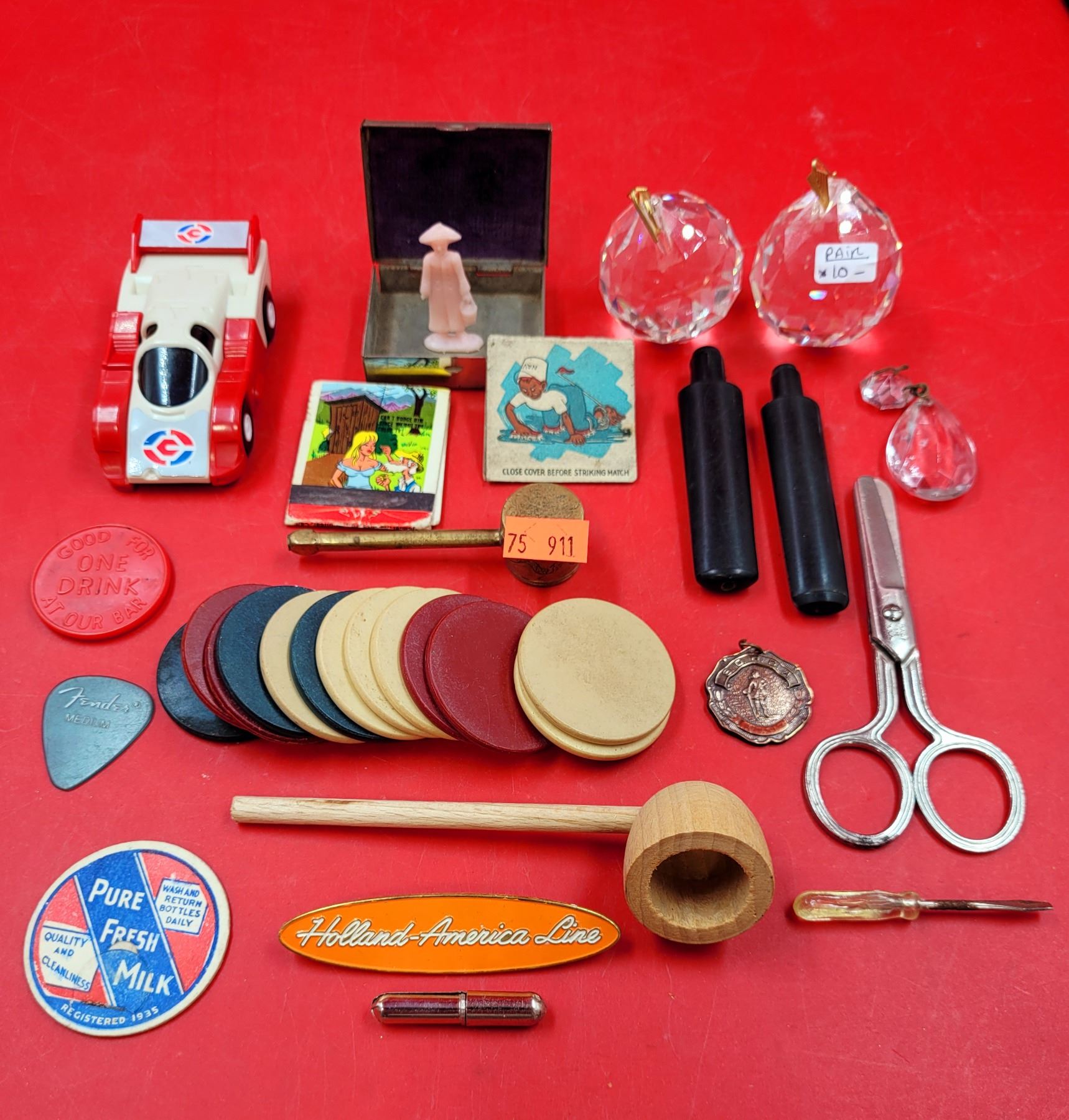 VTG Smalls Lot w/ Matches, Milk Cap, Drink Token, Pipe, & More