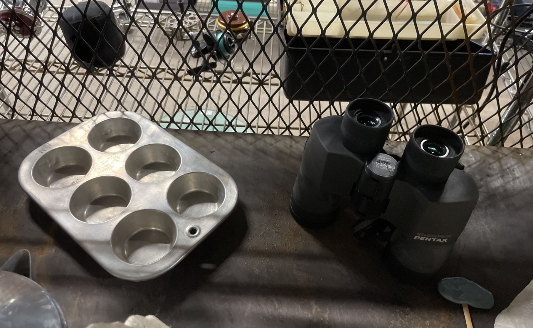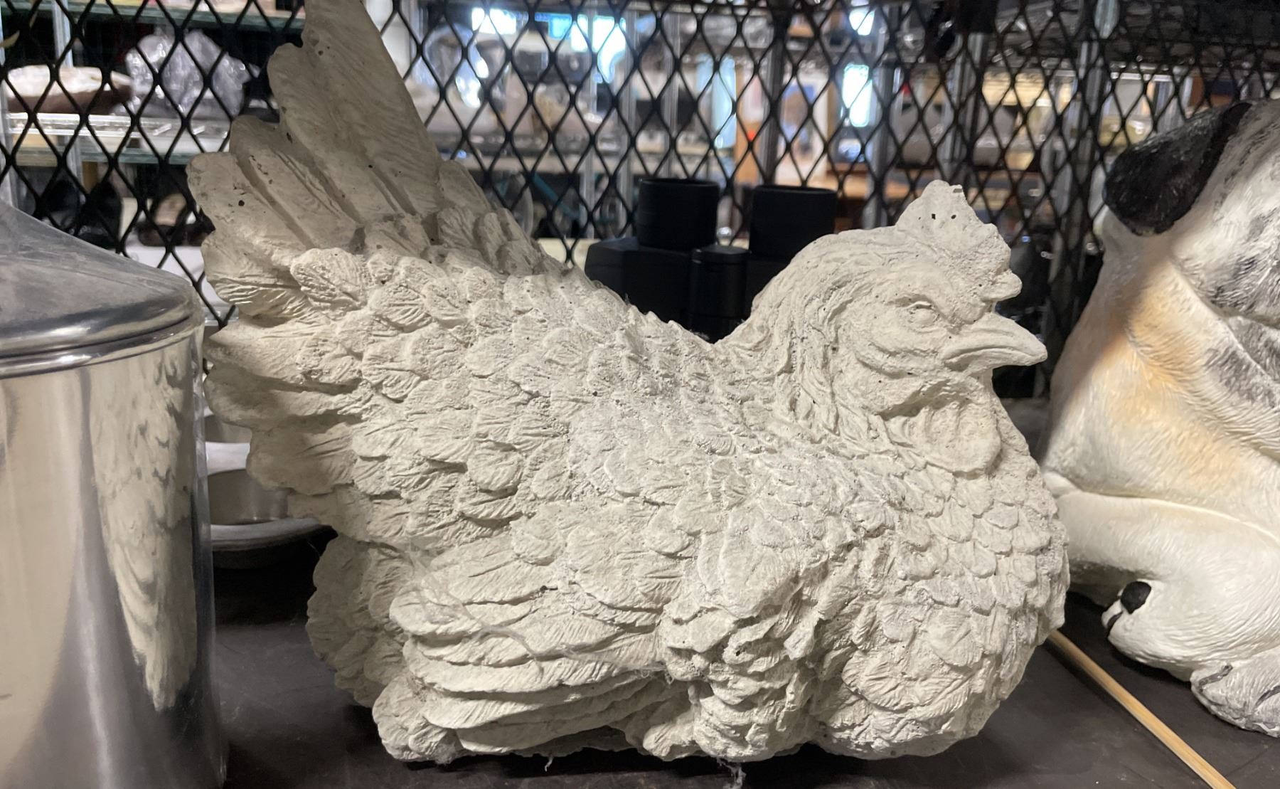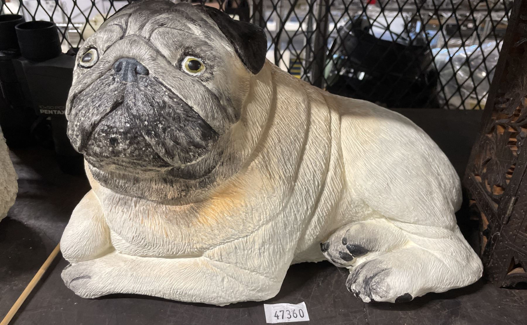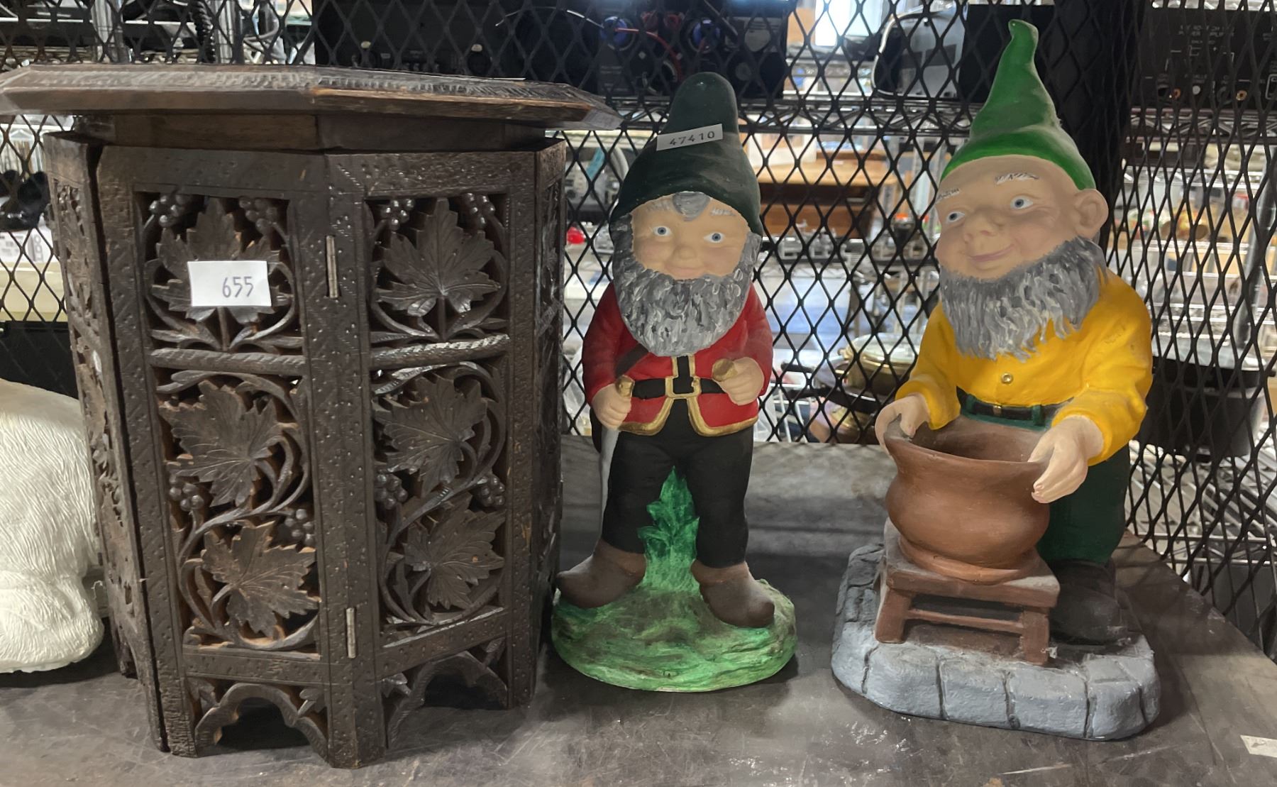 VULCAN SIZE 9 RUBBER BOOTS, GARDEN DECOR ITEMS - GNOMES, PUG STATUE, ROOSTER STATUE, METAL BENCH, BINOCULARS & MORE