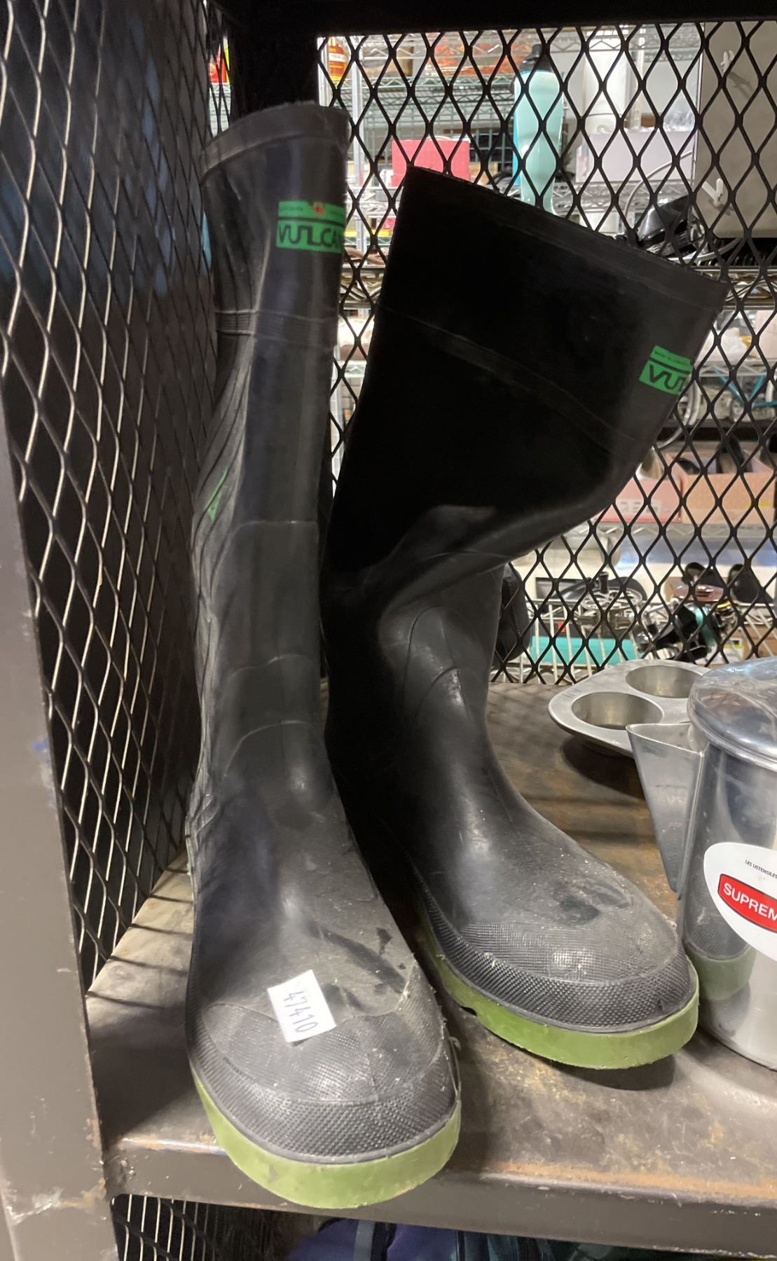 VULCAN SIZE 9 RUBBER BOOTS, GARDEN DECOR ITEMS - GNOMES, PUG STATUE, ROOSTER STATUE, METAL BENCH,
