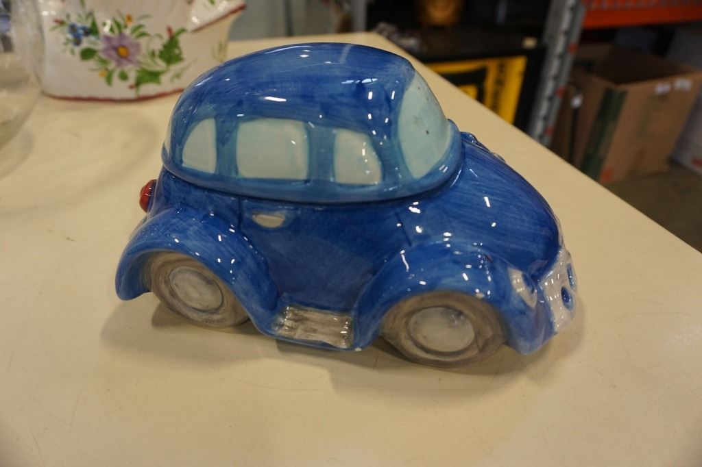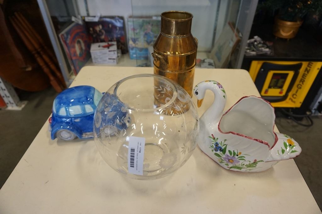 VW lidded jar, brass can, hand painted swan and glass bowl
