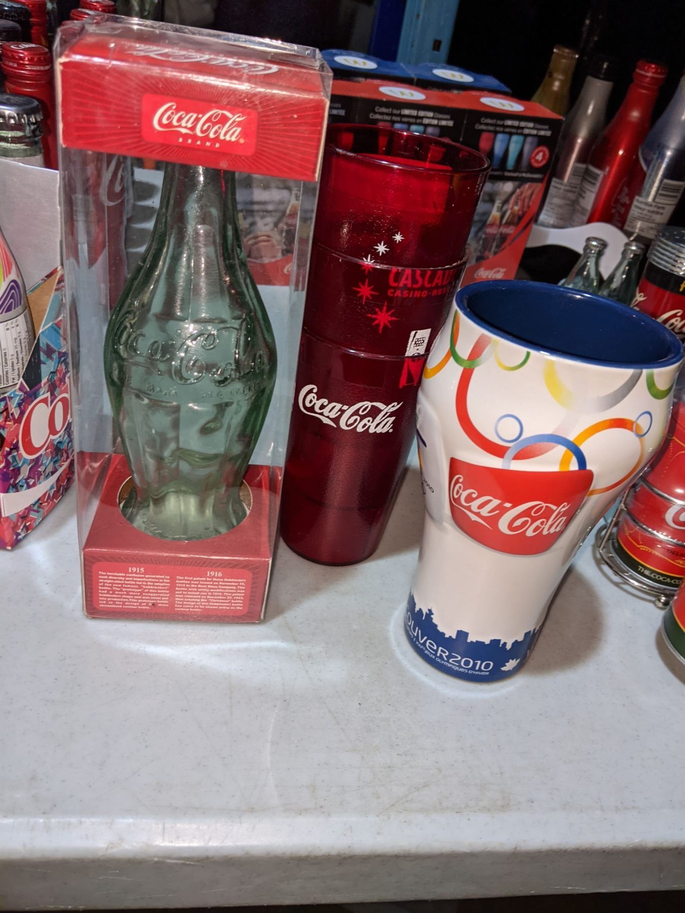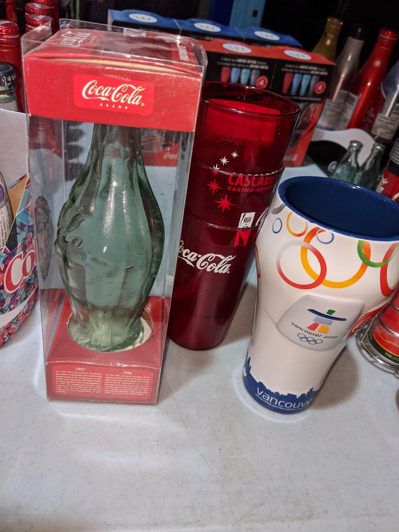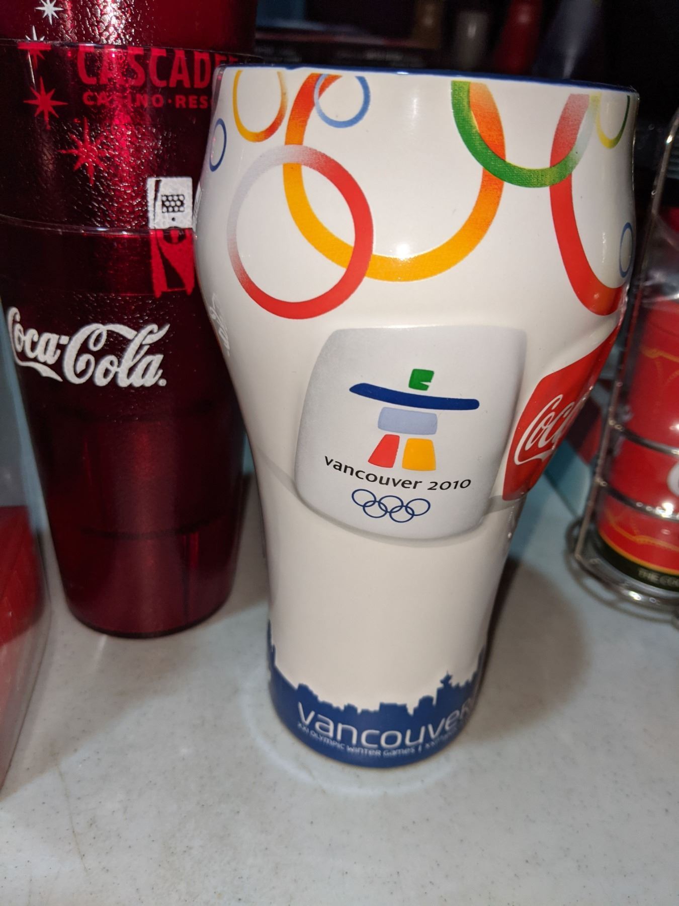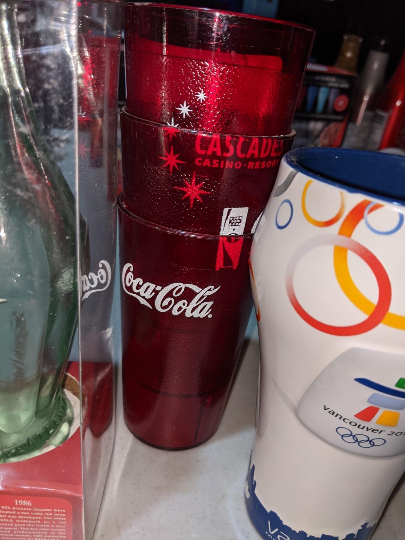 Vancouver 2010 Olympics Coca-Cola glass with collectible Coca Cola bottle and three plastic glasses