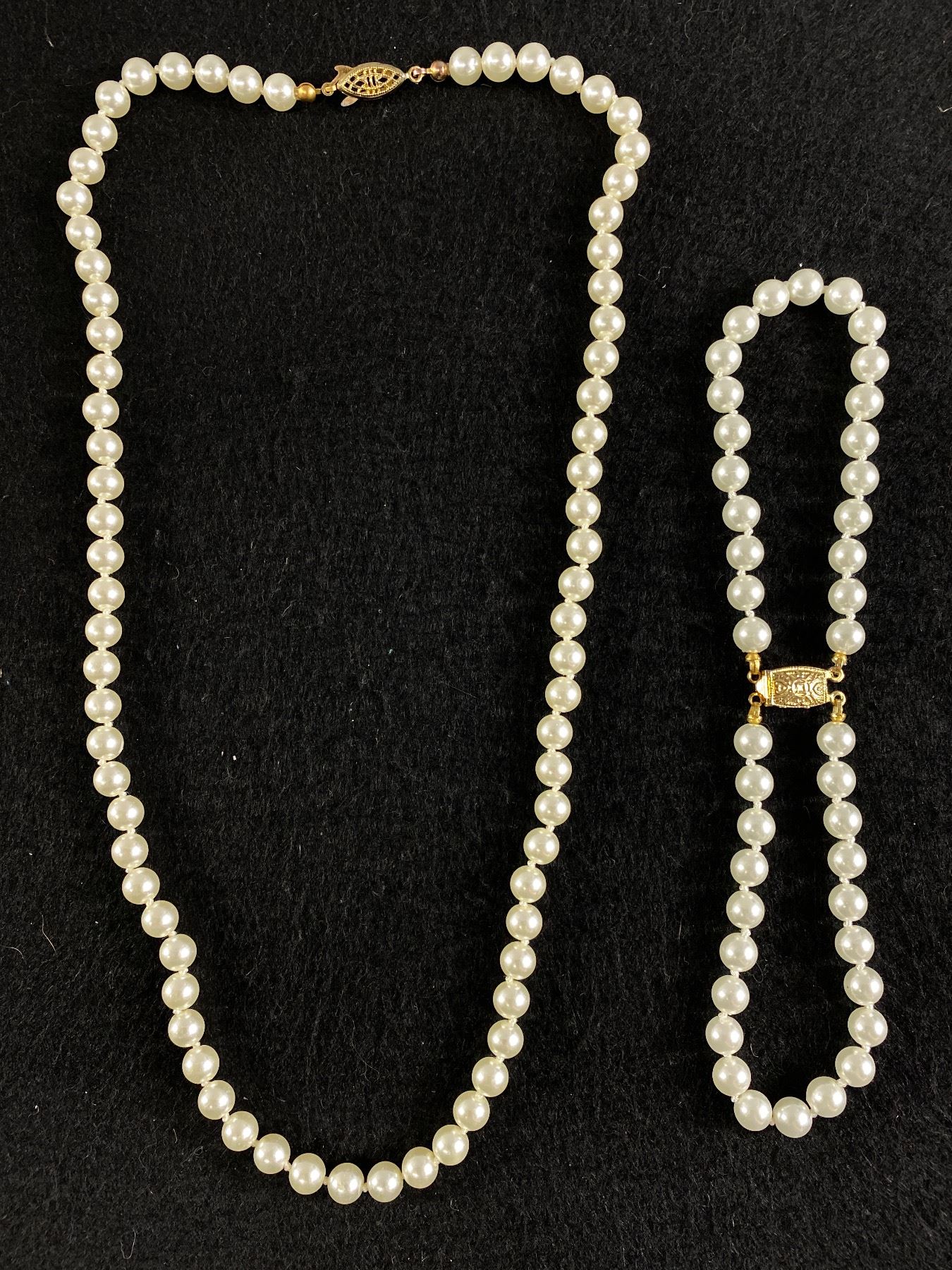 Very Classy, Vintage Hand Knotted Faux Pearl Necklace 23" L with Interesting Double Strand Bracelet
