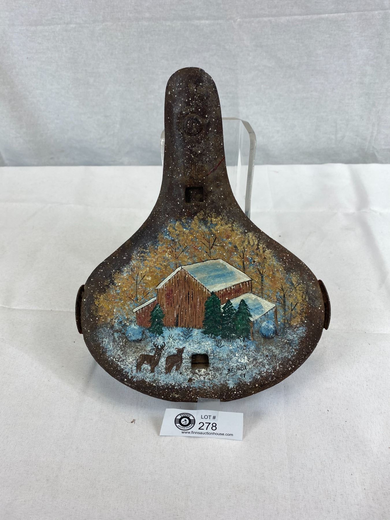 Very Cool Painting, Signed On An Antique Bicycle Seat, Folk Art