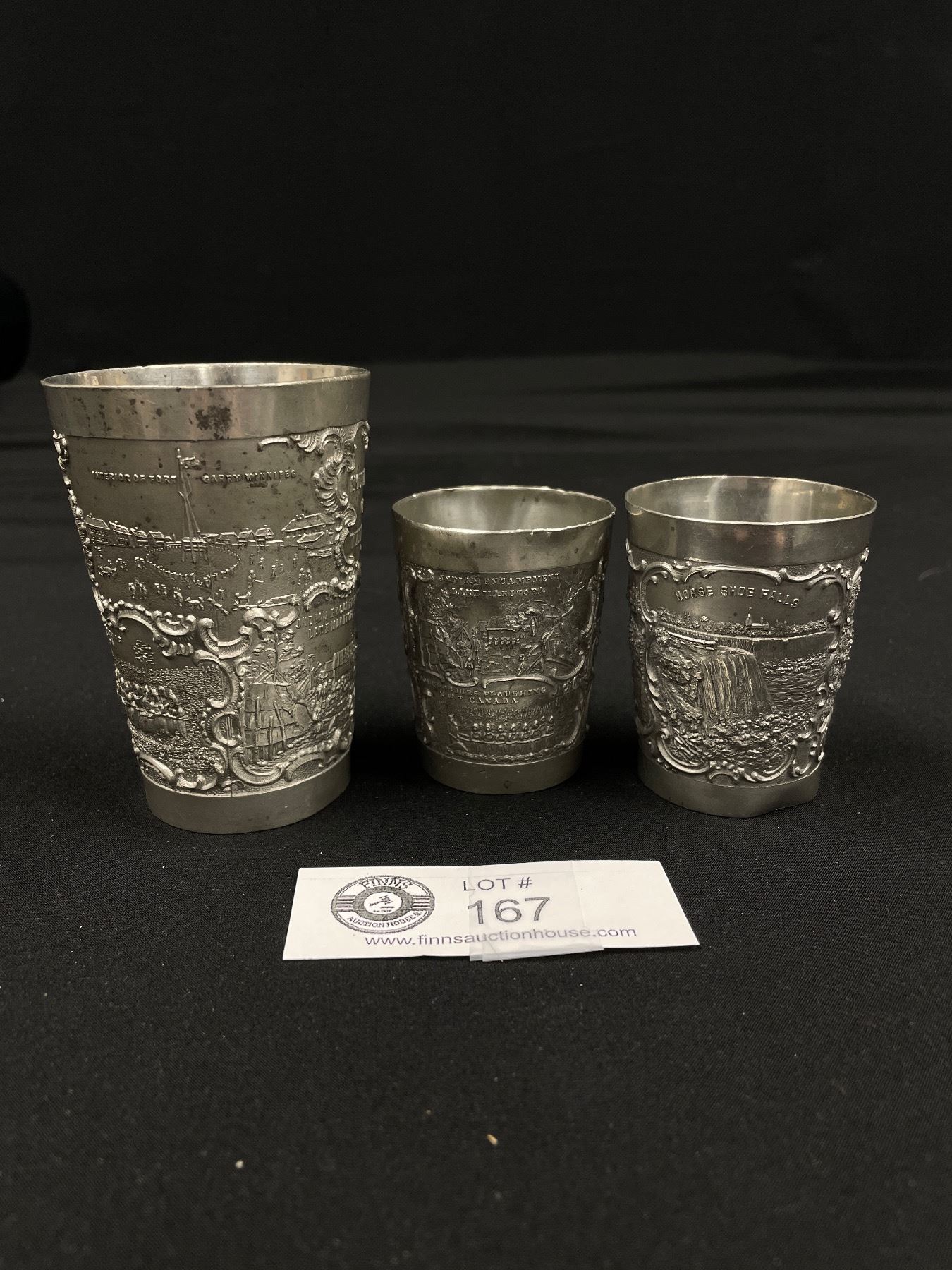 Very Early Winnipeg Souvenir Cup 1880-1900 Plus 2 Very Early Pewter Souvenir Cups Niagra Falls & Winnipeg