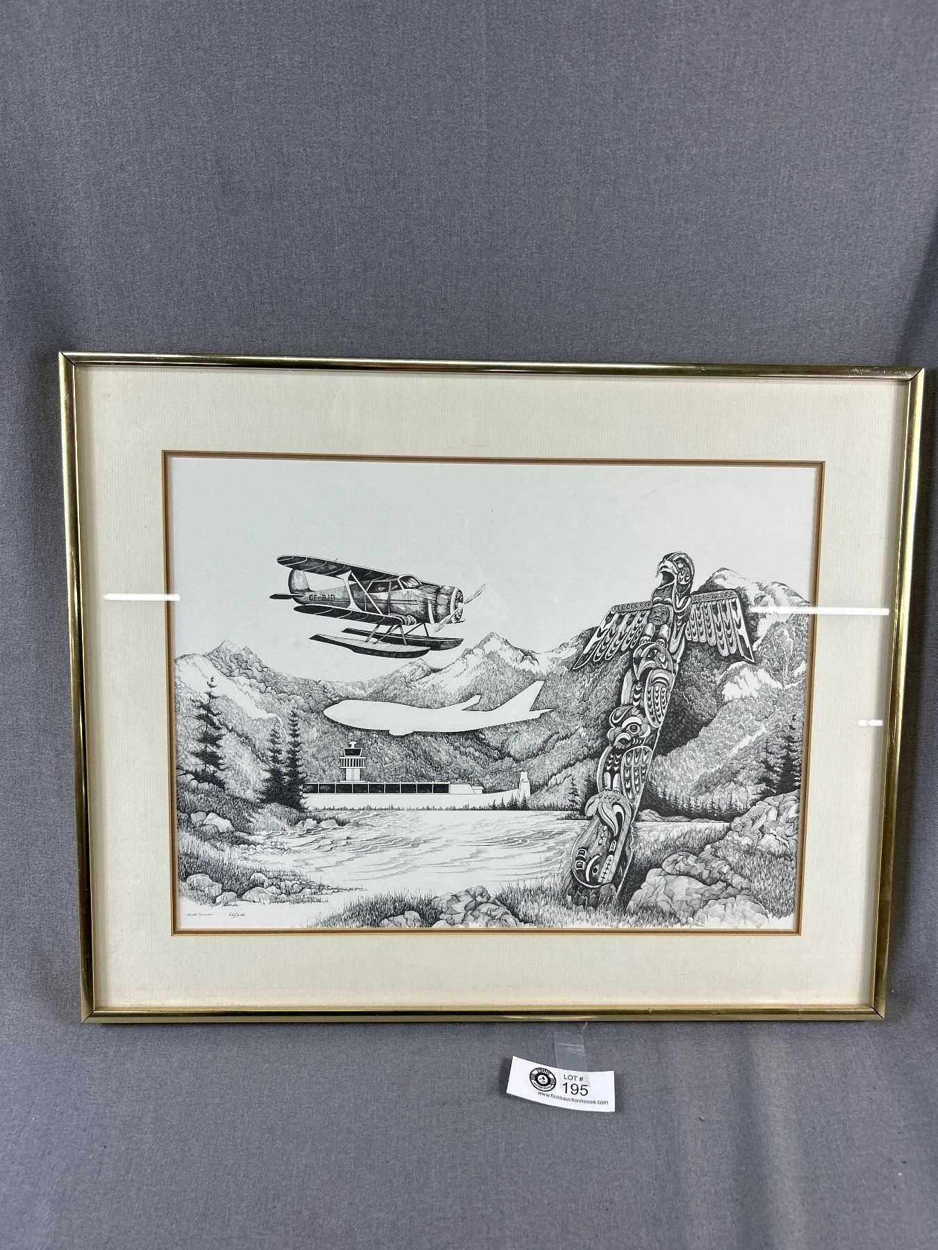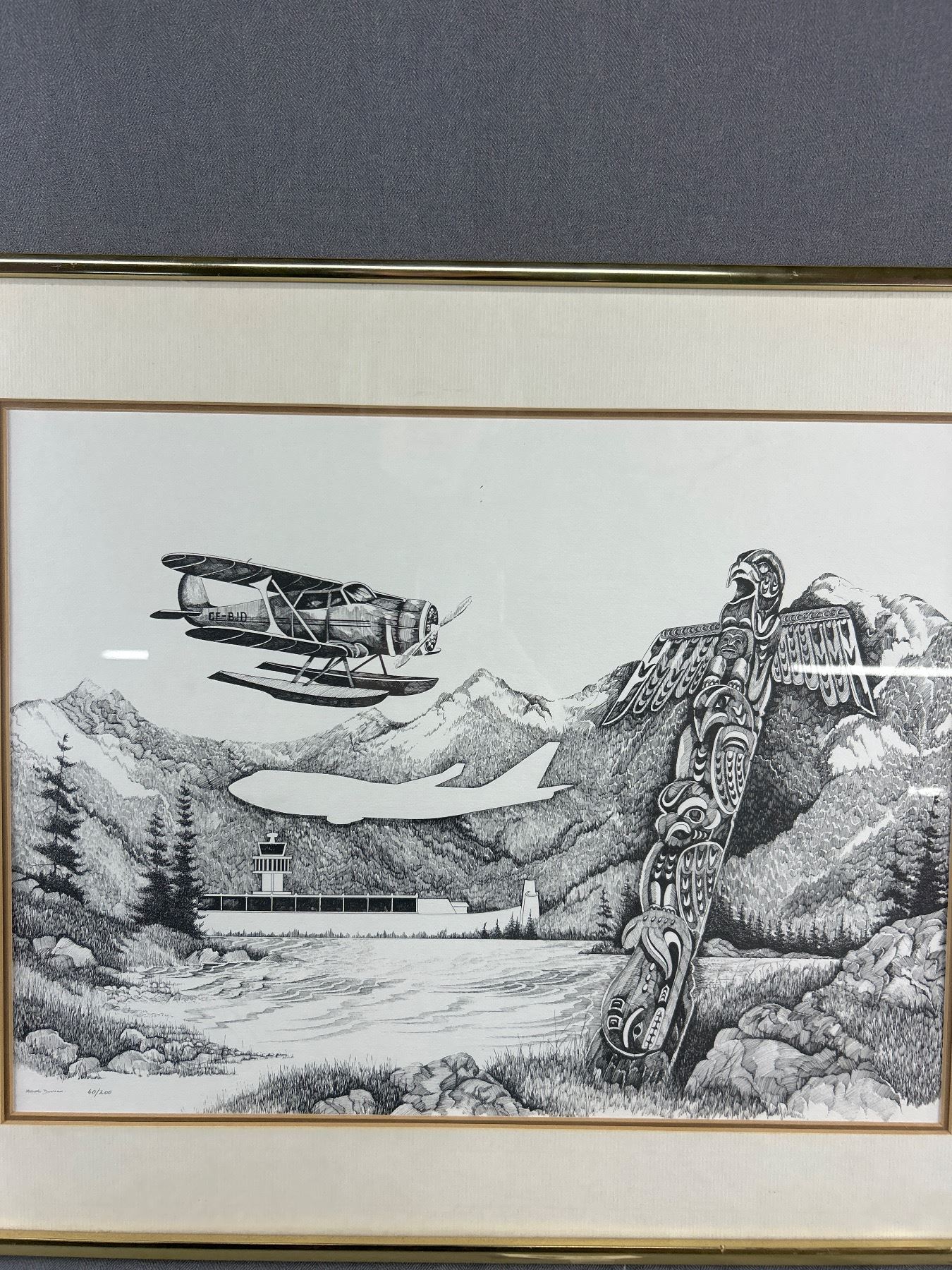 Very Nice Michael Duncan Fine Ink Print #60/200 Circa 1990s, A Classic and Very Detailed Picture of Totem Pole and Modes of Transportation of Vancouver Island, Measure Approx 16.5" x 20.5" No Shipping