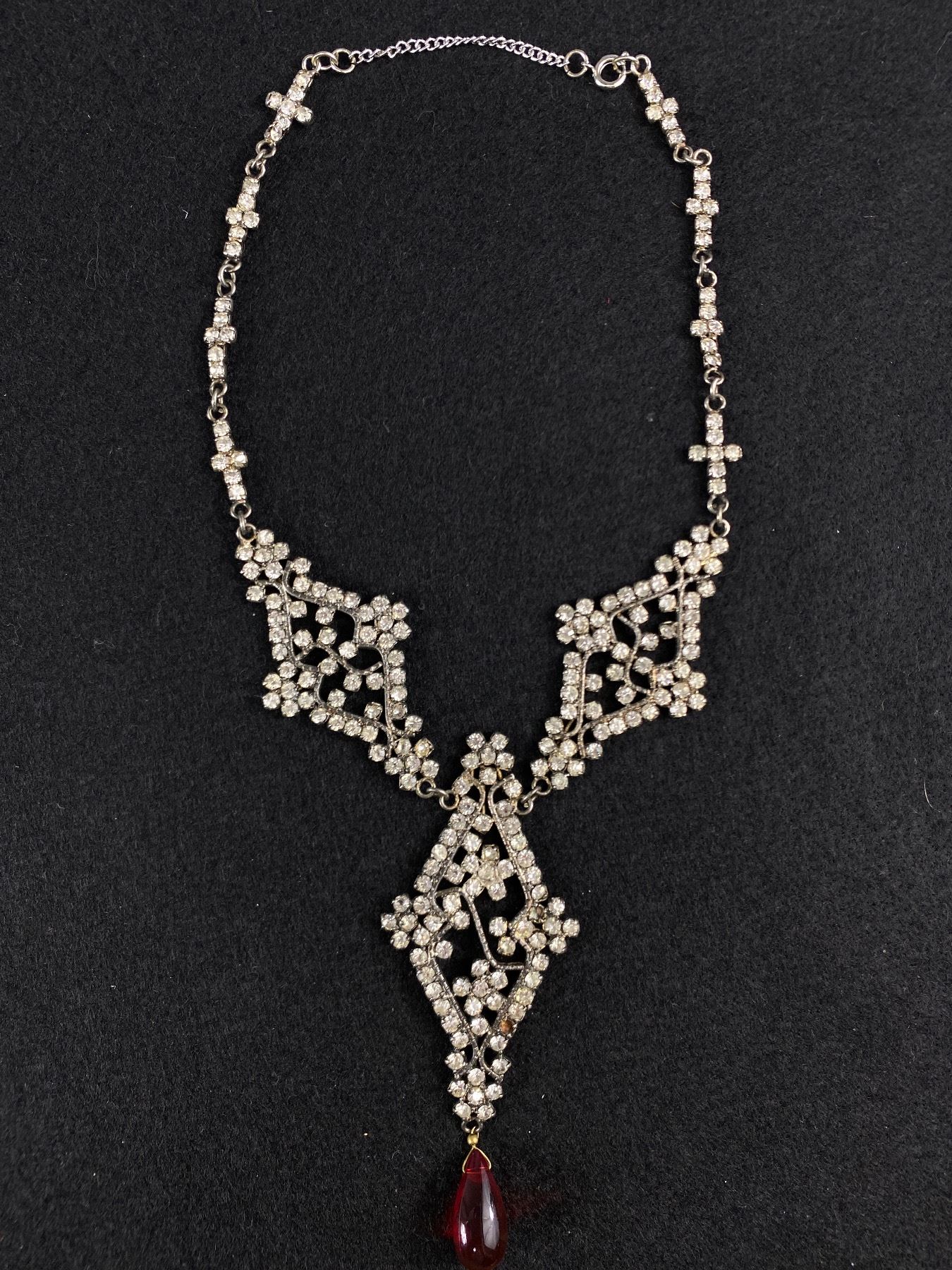 Very Nice Vintage Rhinestone Necklace w/ Ruby Glassdrop
