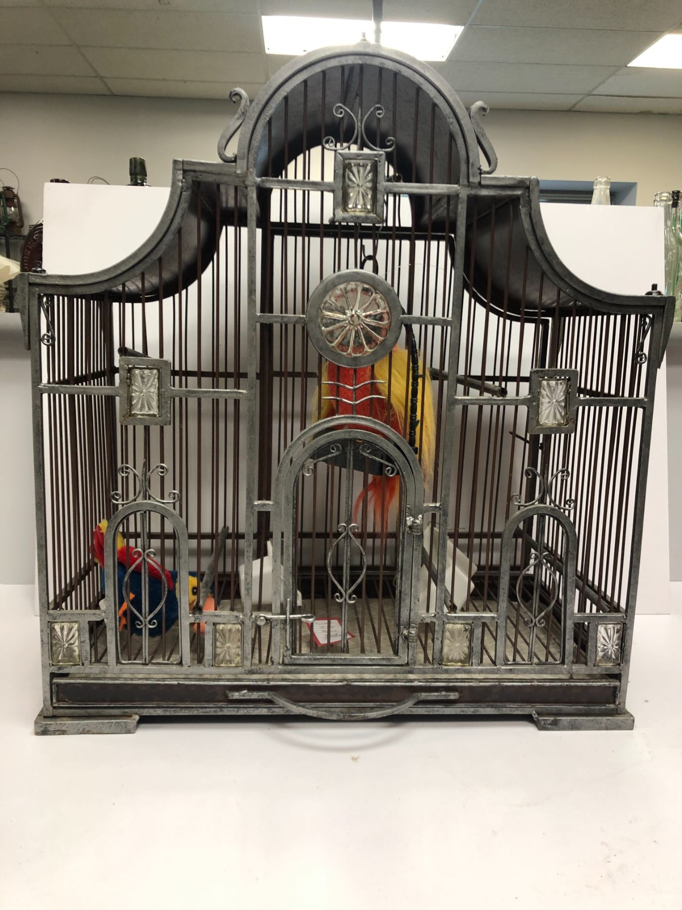 Very heavy metal w/ glass block bird cage w/ matching metal stand (cage came w/ note claims circa. 1890 France Belle Époque?)