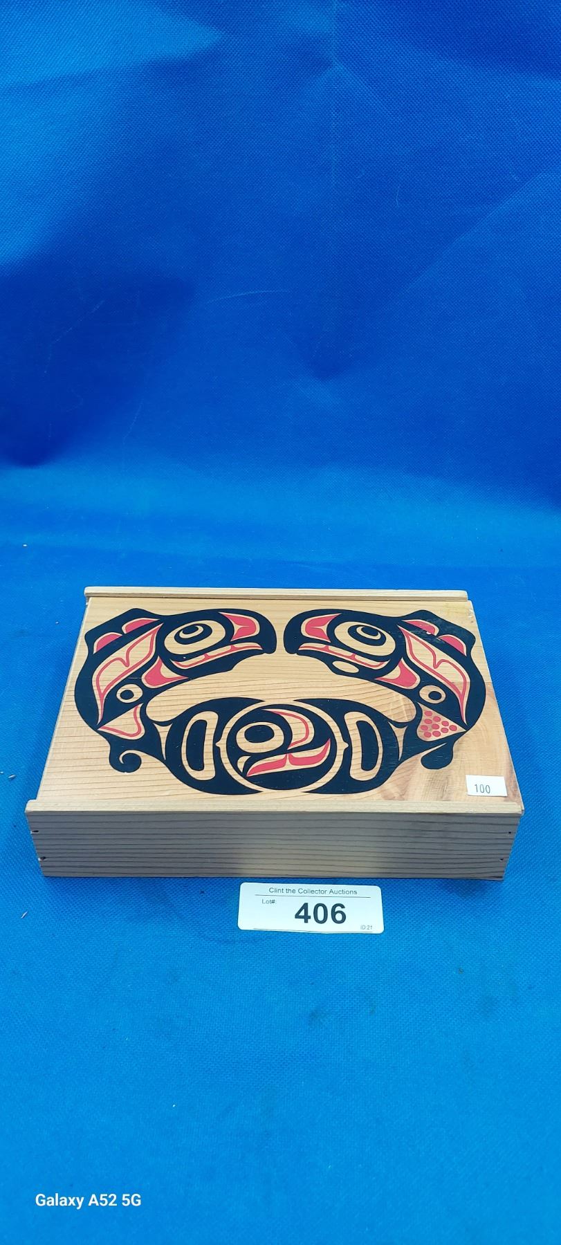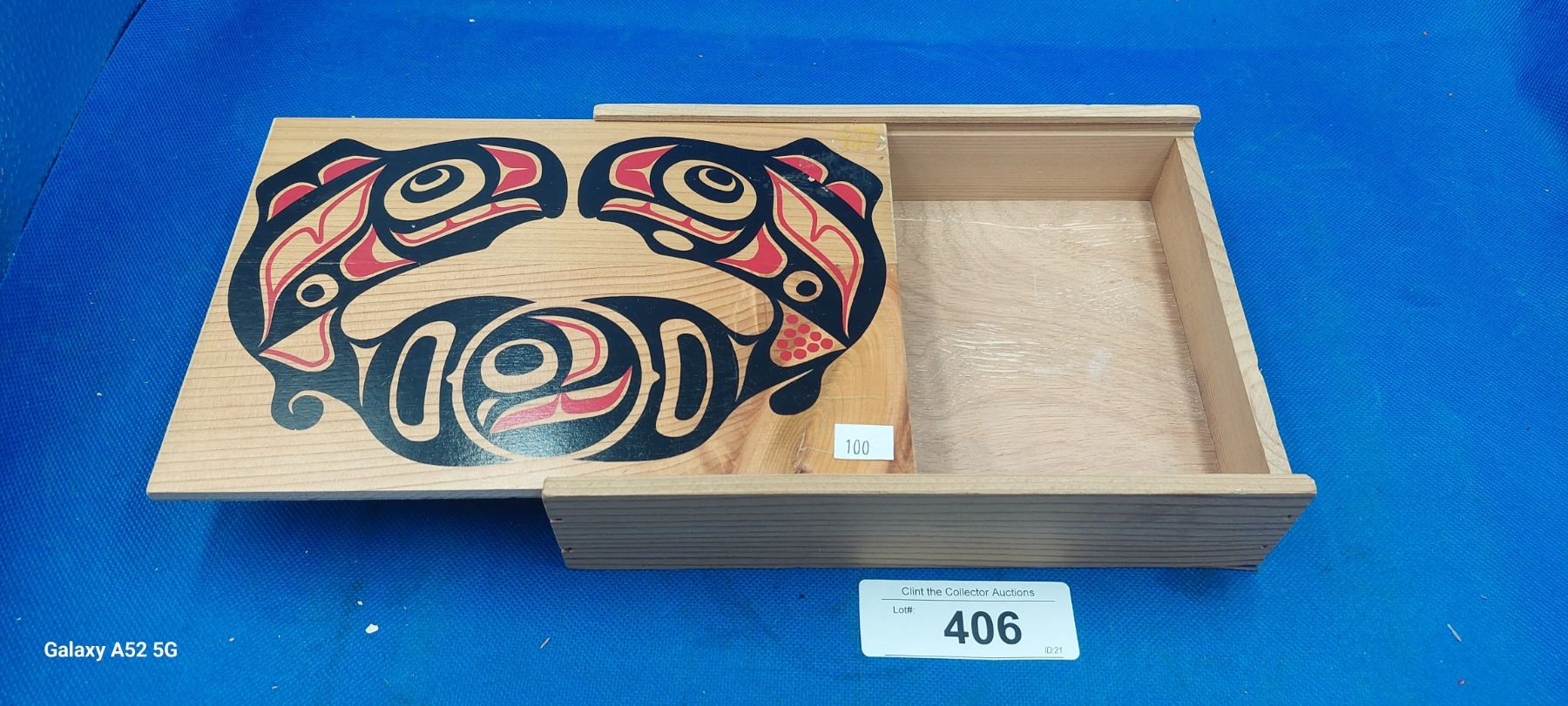 Very nice "Killer Whales" westcoast indigenous art cedar box 9"x6"x2"