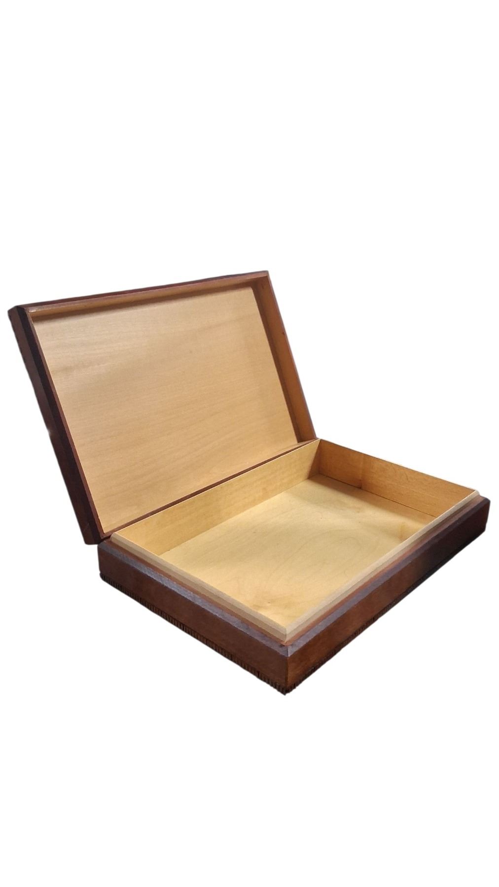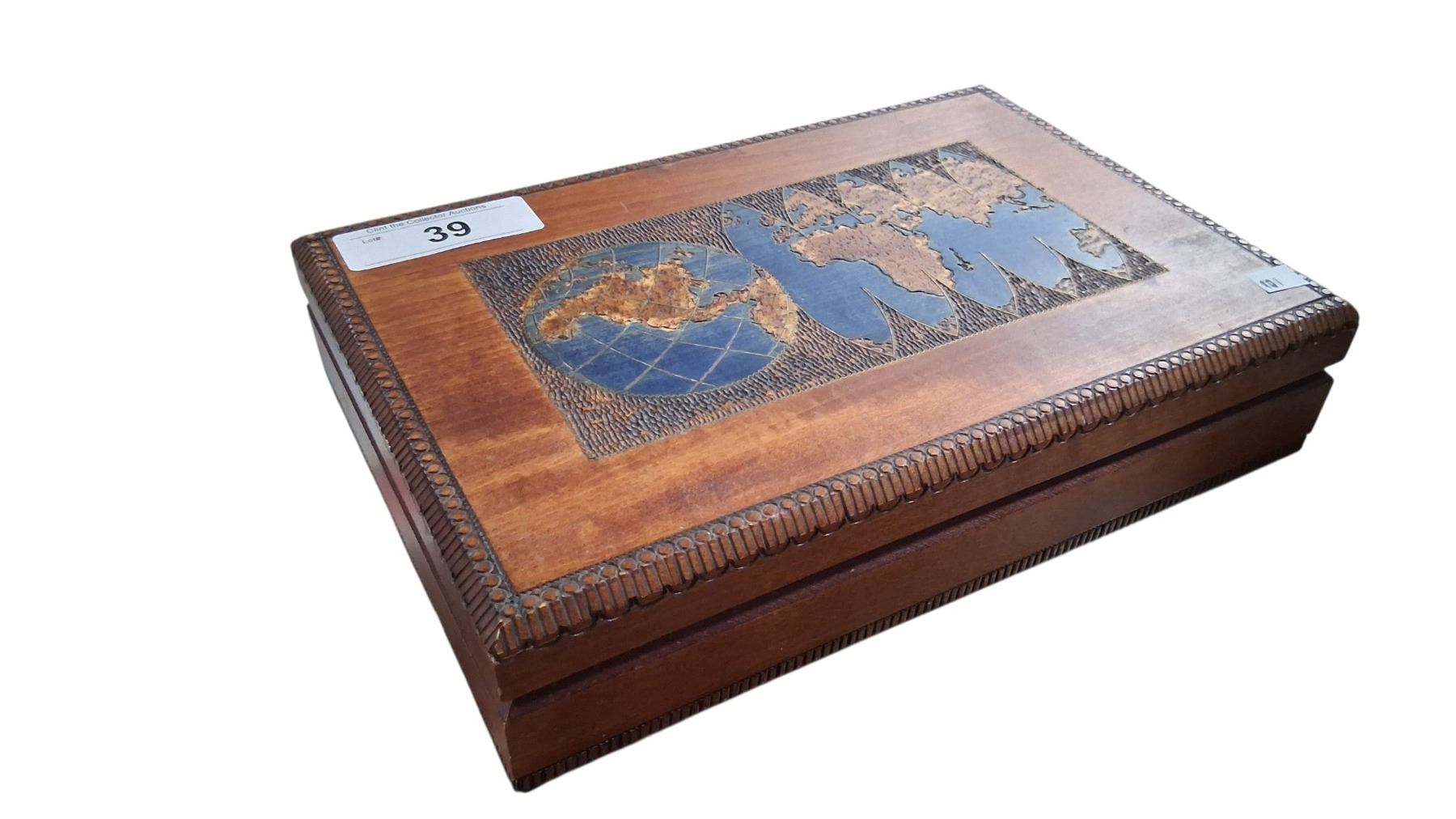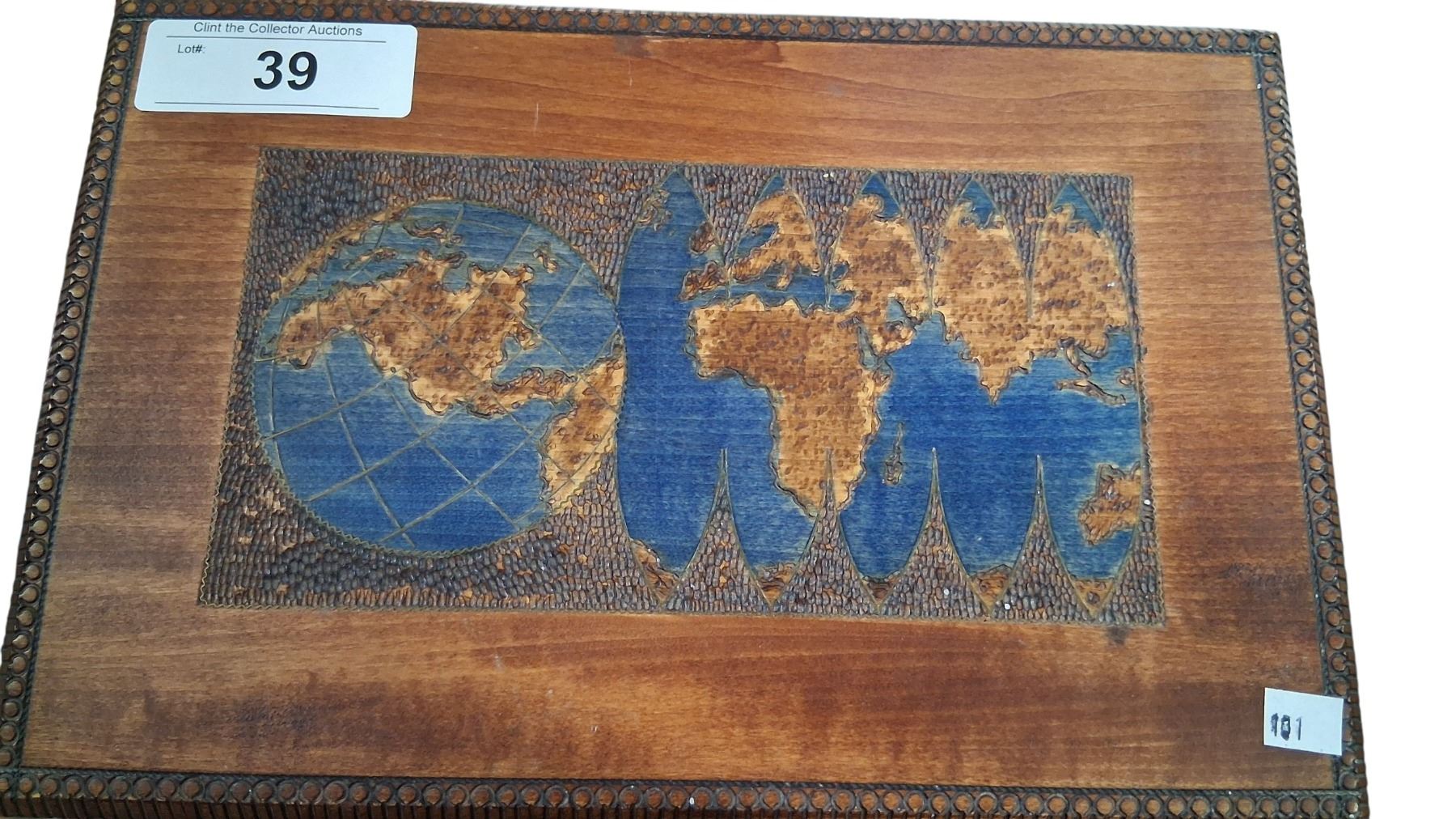 Very nice folk art wooden box with world map on lid 12"x7"x2"