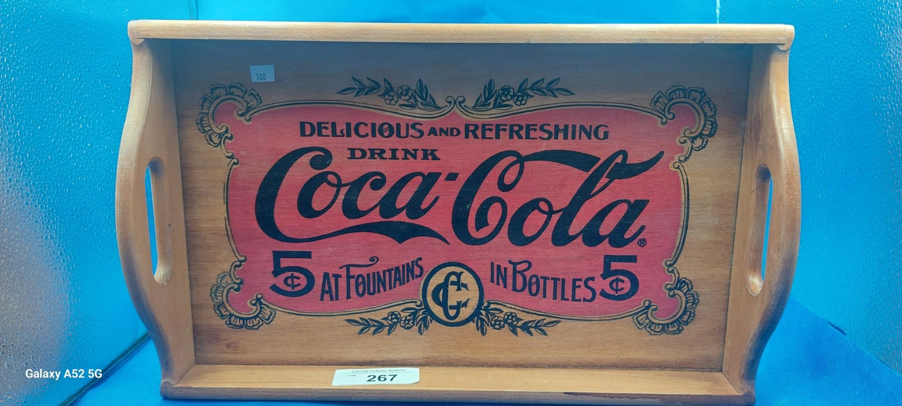 Very nice large wood Coca Cola 5 cent fountain serving tray, older reproduction