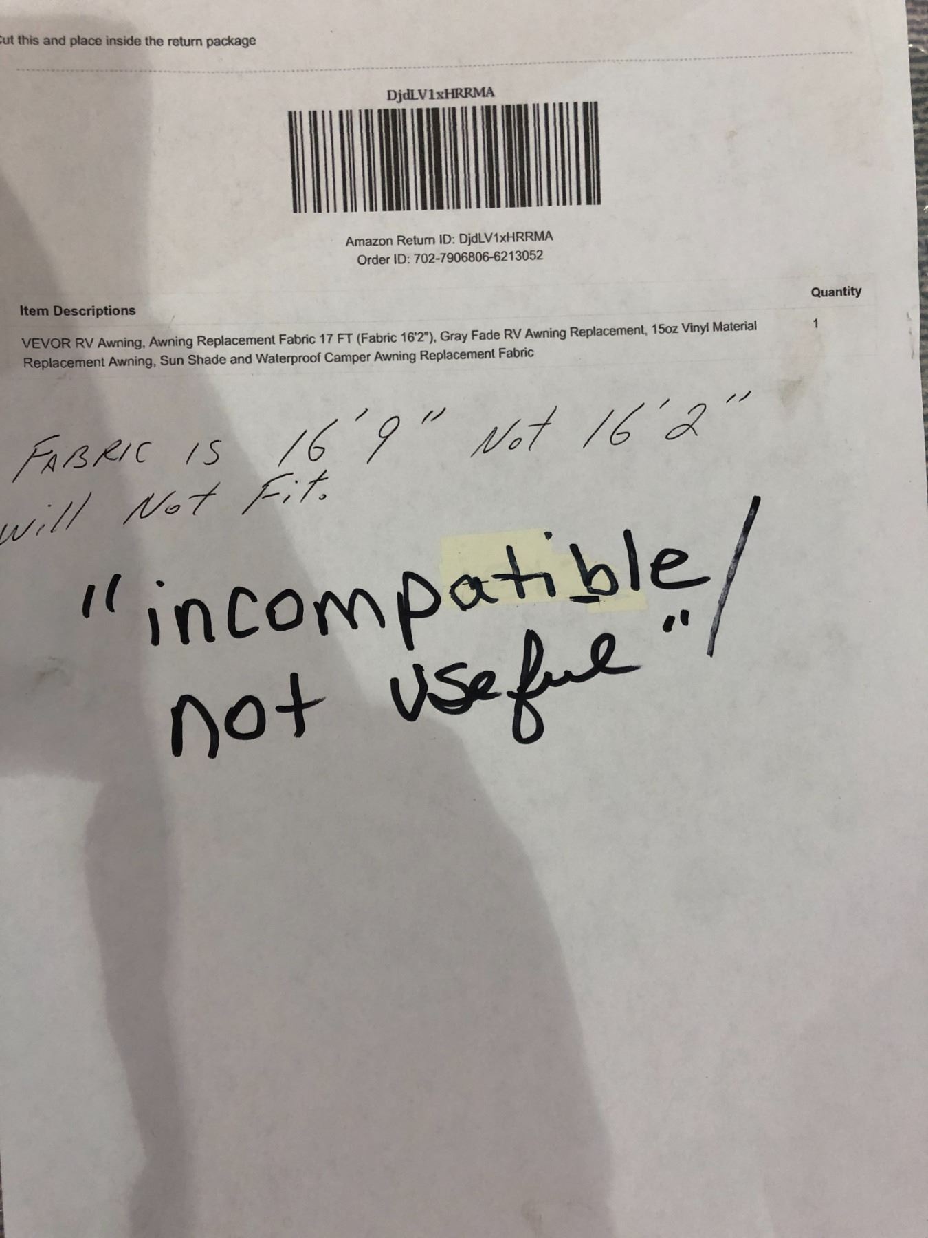 Vevor -RV awning fabric 16ft 9"