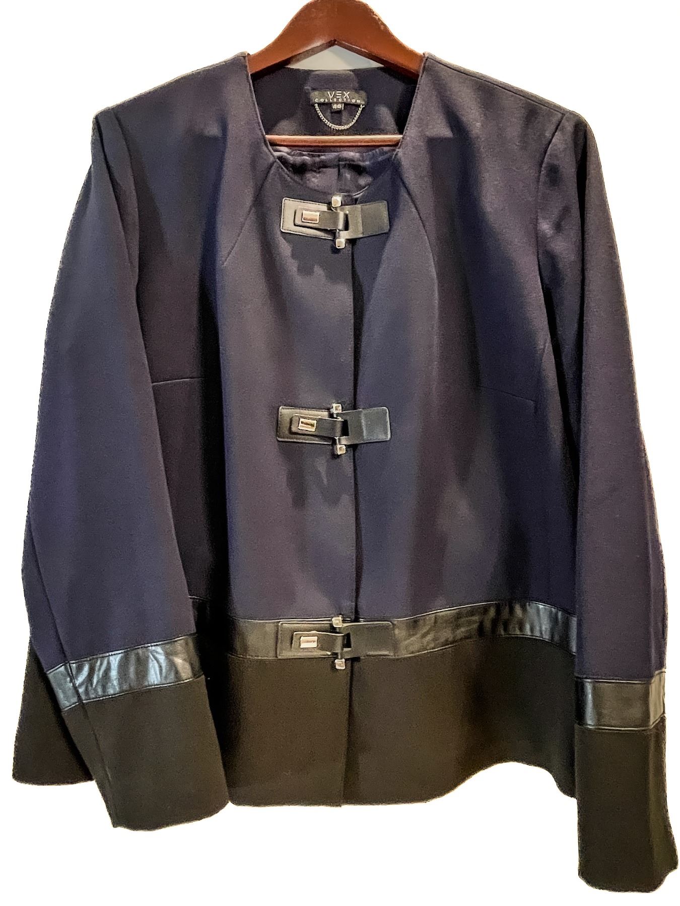 Chic Vex women’s blazer in navy and black color block design, accented with faux leather trim at the hem and cuffs. Features distinctive modern toggle-style front closures and a clean, collarless neckline. European size 46, fits approximately a Canadian XL. Elegant, structured silhouette perfect for professional or evening wear. Excellent condition.