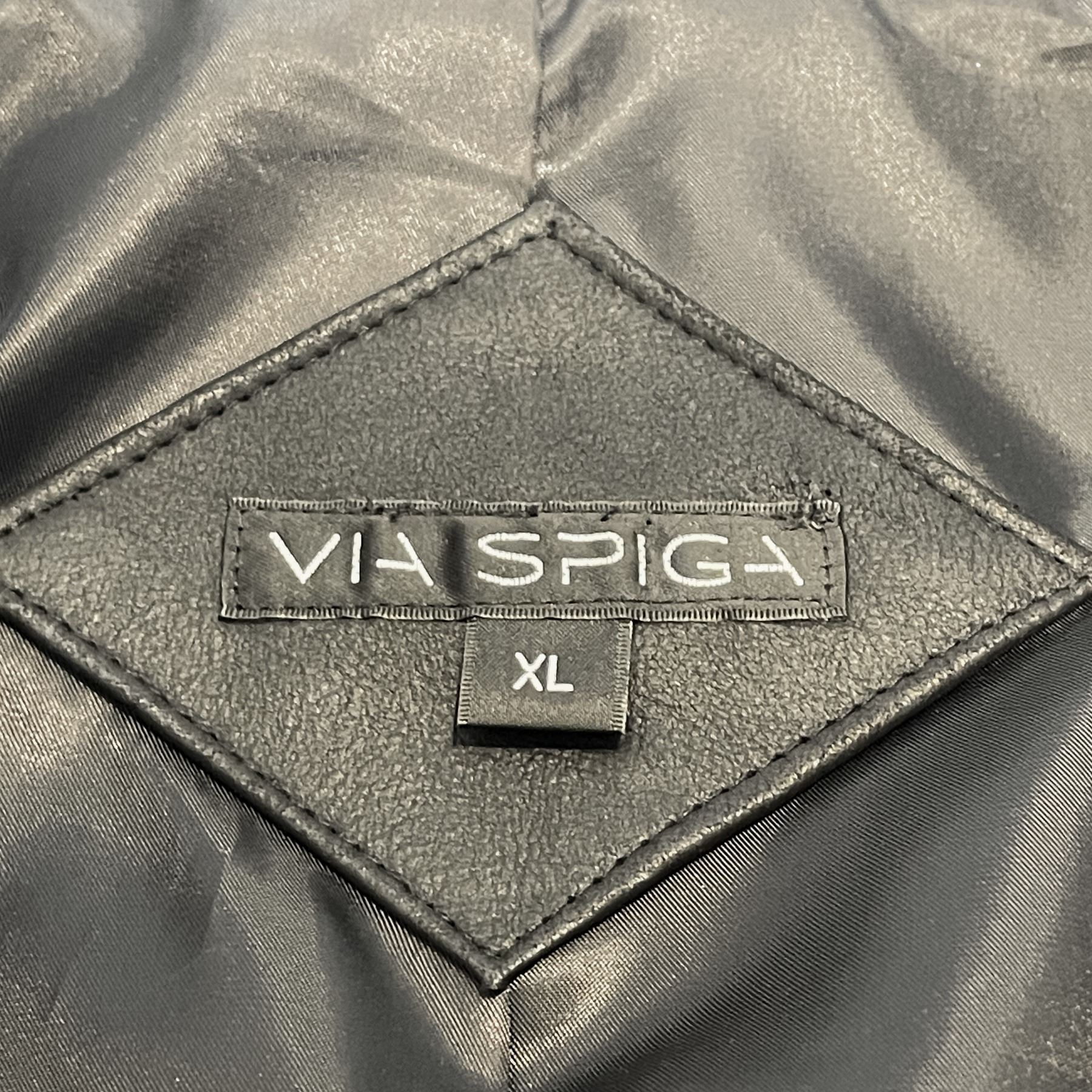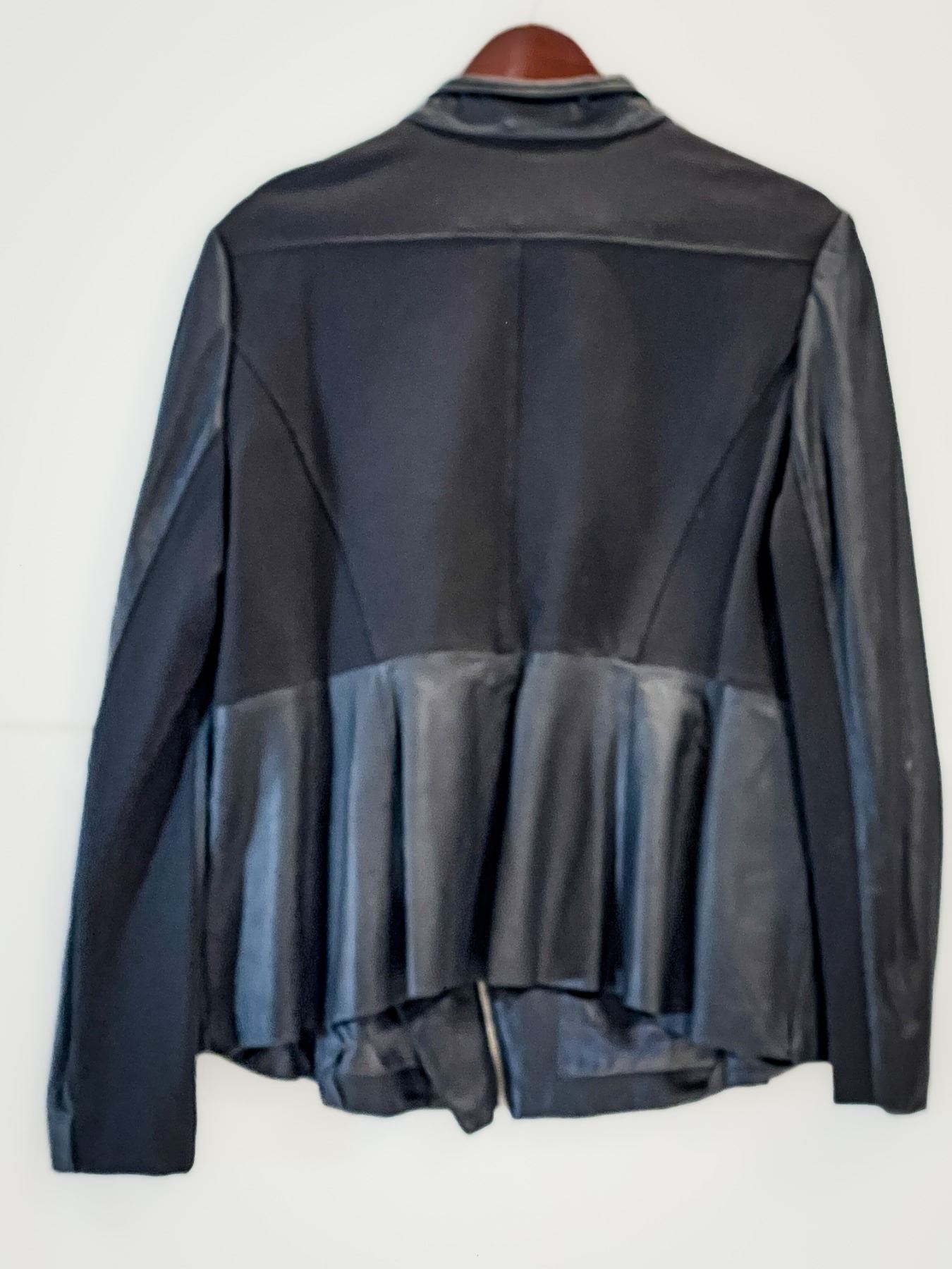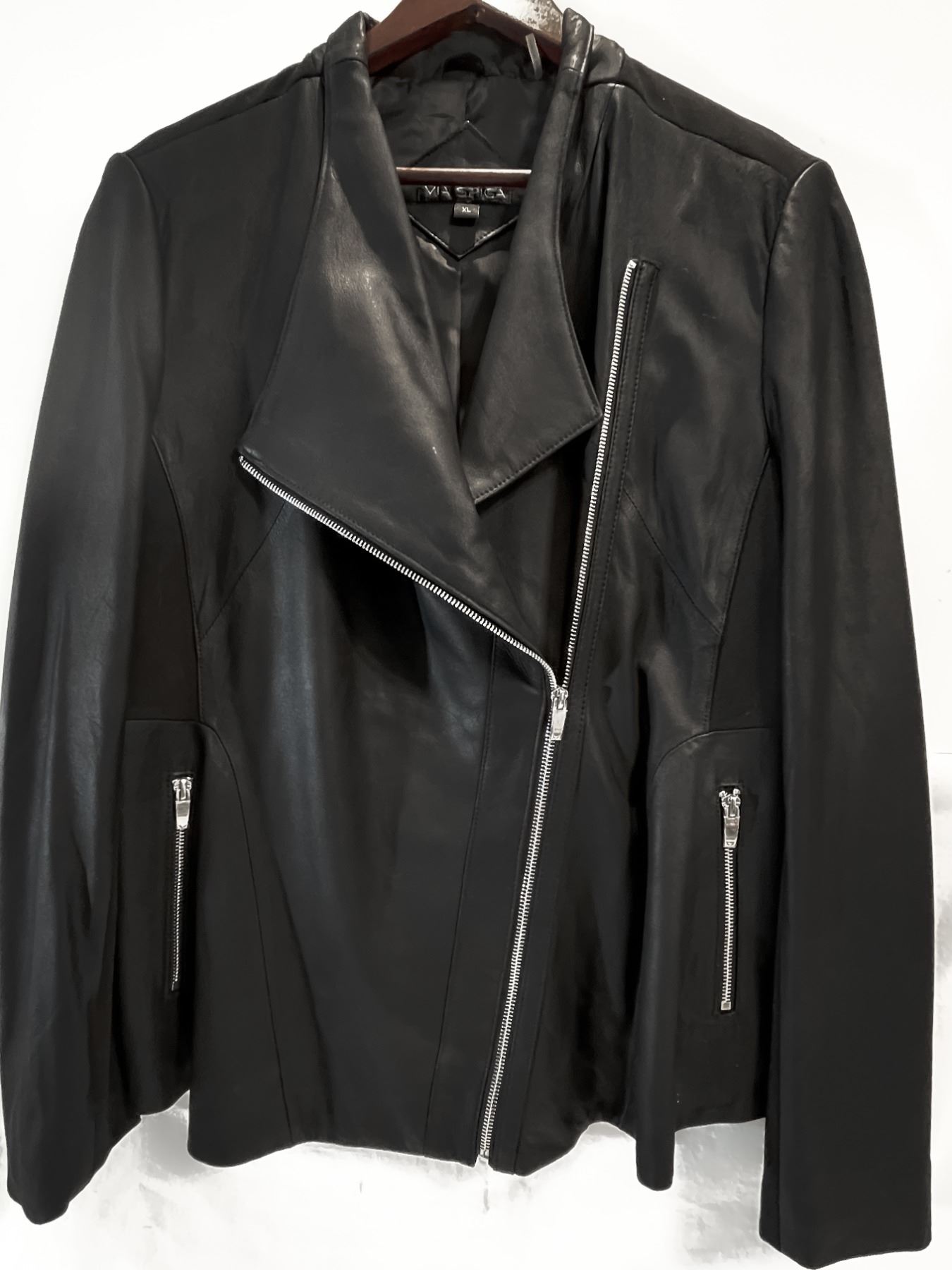 Stunning Via Spiga women’s moto-style leather jacket in supple black lamb leather, size XL. Features an asymmetrical front zip, silver hardware, and a beautifully tailored peplum-style back for a flattering silhouette. The combination of soft leather and stretch panels provides both comfort and shape. Fully lined and in excellent condition