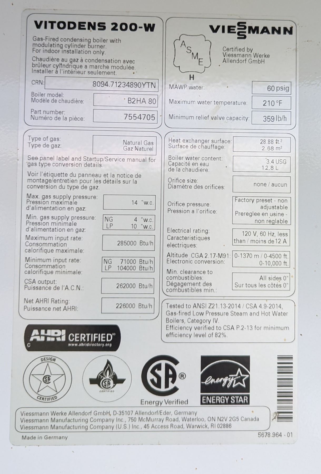 Viessmann Propane Boiler. 285,000BTU boiler. Low hrs. Data plate in the pictures.