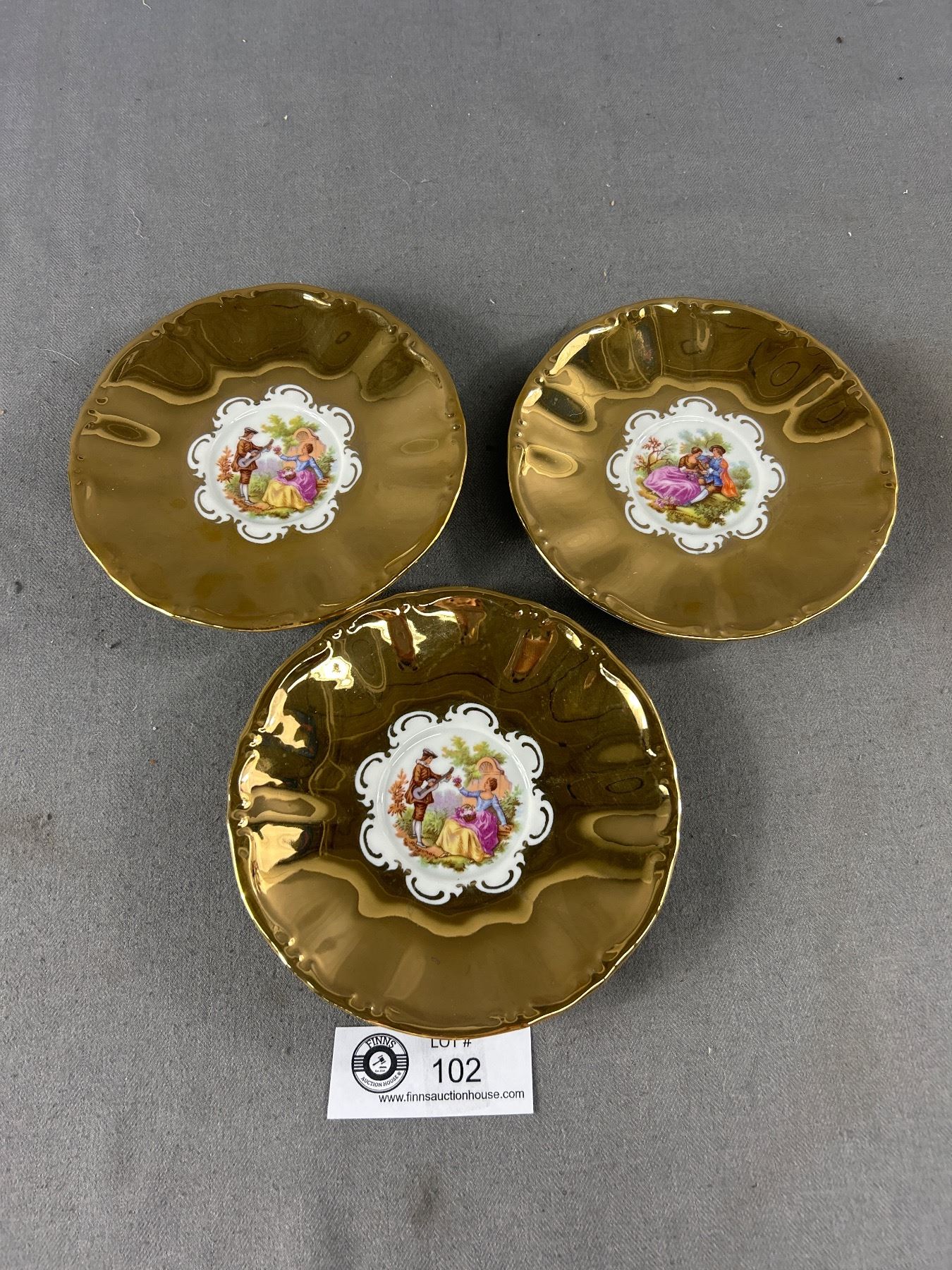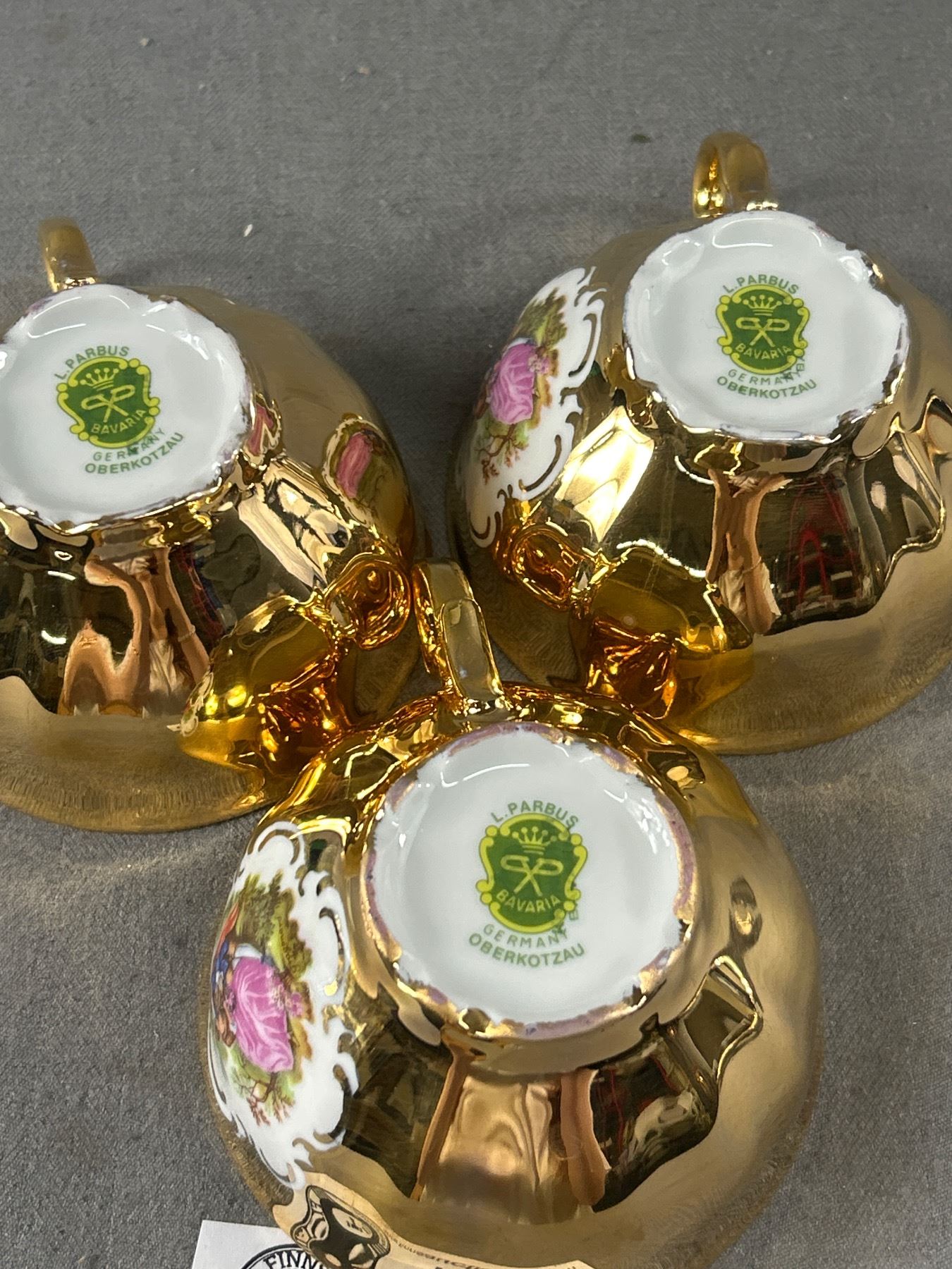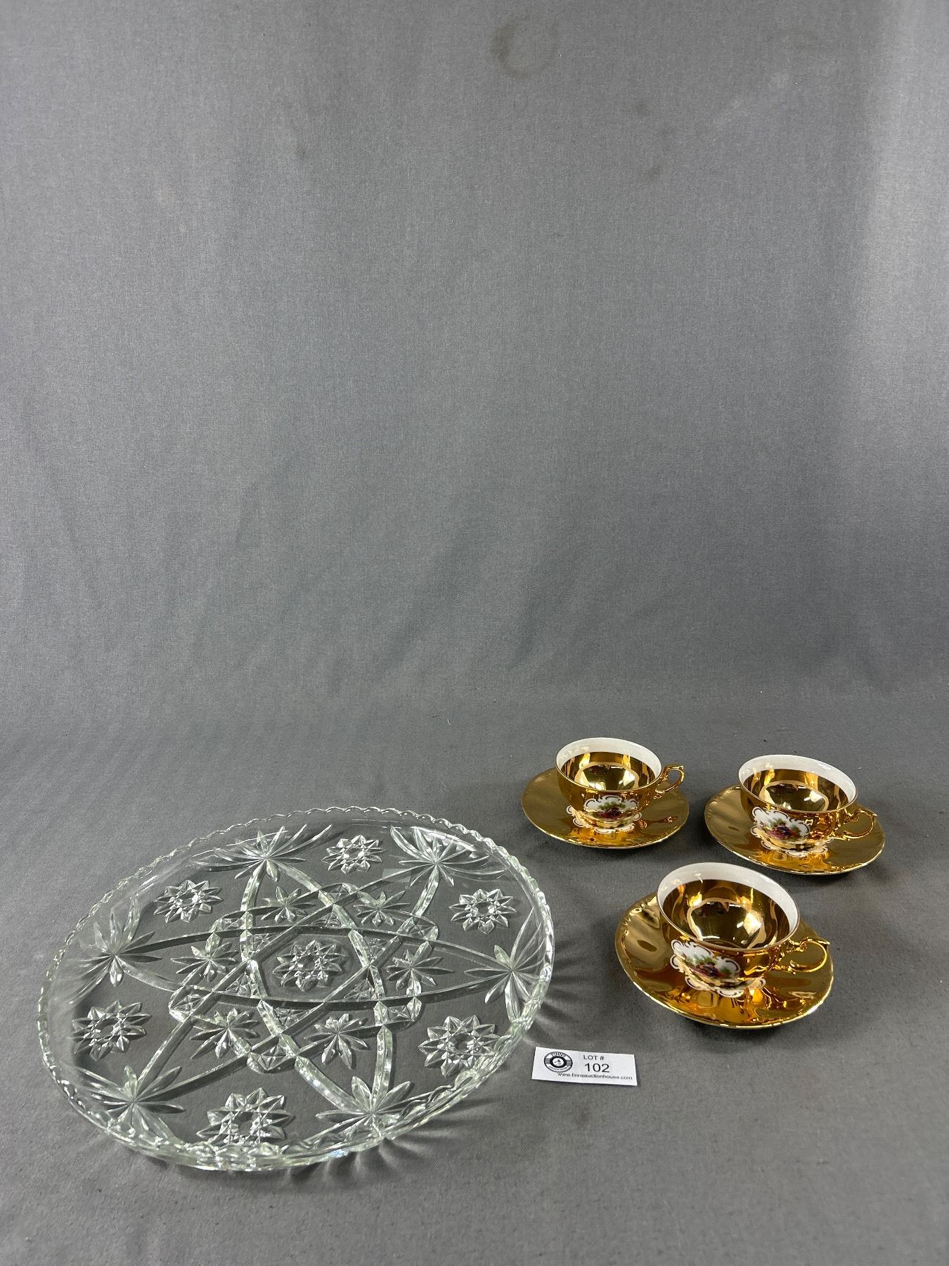 Vintage 13.25" Diam Glass Serving Plate & 3 Matching Gold "L.Parbus" Bavaria Germany Teacups w/ Saucers