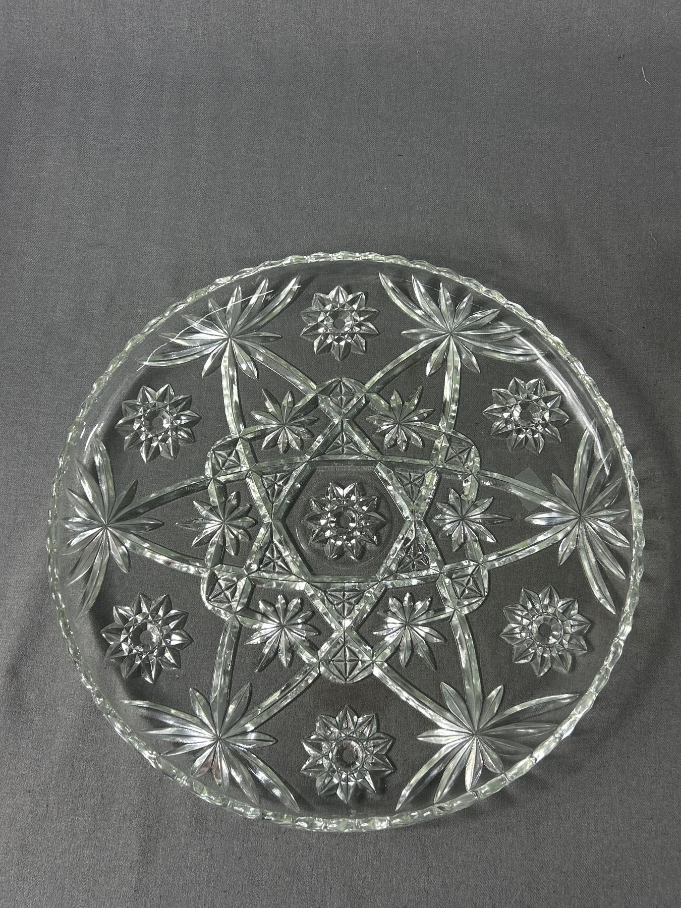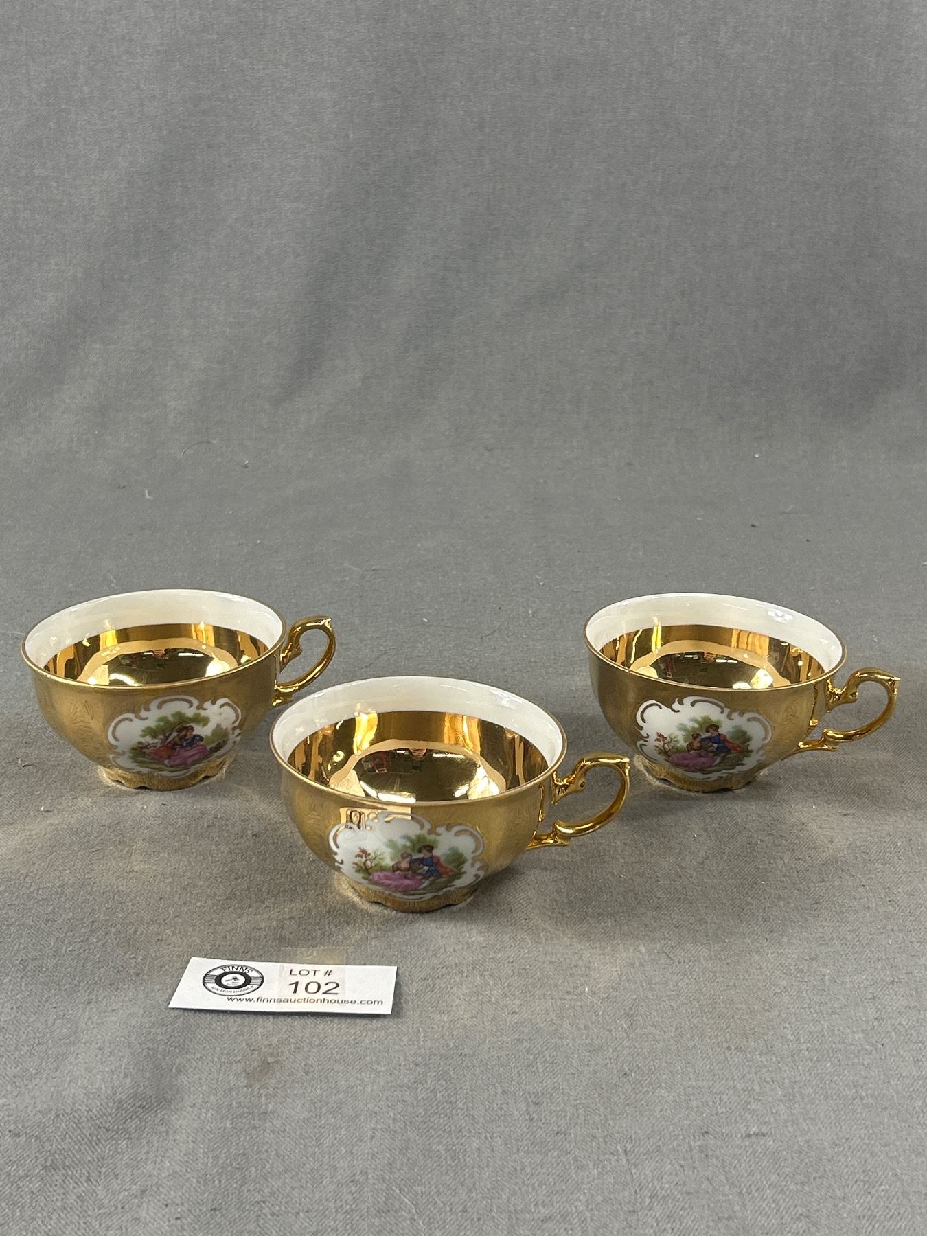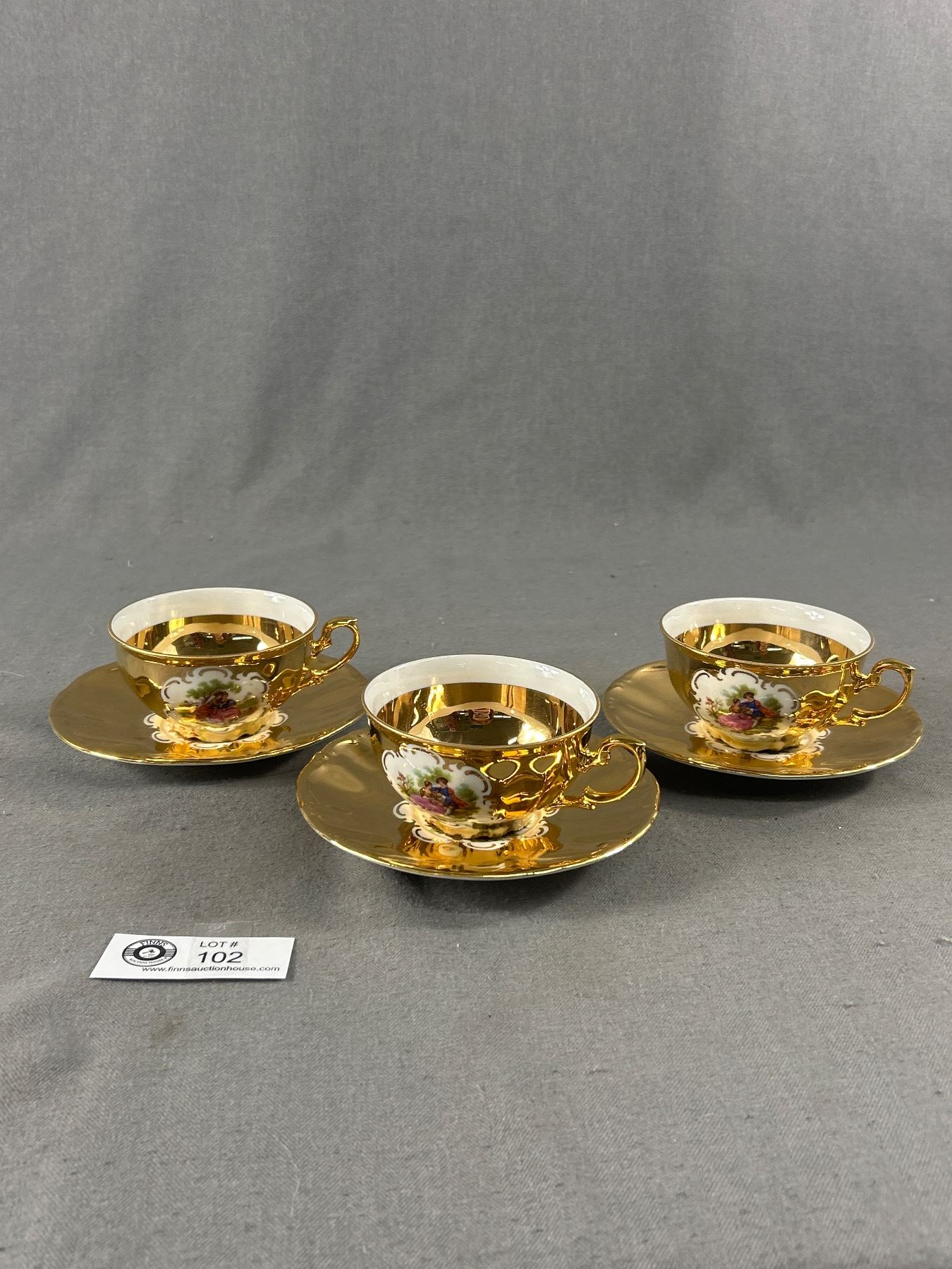 Vintage 13.25" Diam Glass Serving Plate & 3 Matching Gold "L.Parbus" Bavaria Germany Teacups w/ Saucers