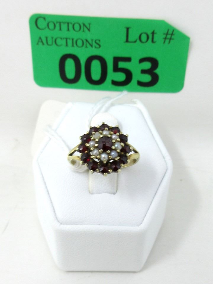 Ring is 13 mm diameter. 12 Faceted round garnets and a circle of 8 man made pearls. Total weight including stones: 3.3 grams.