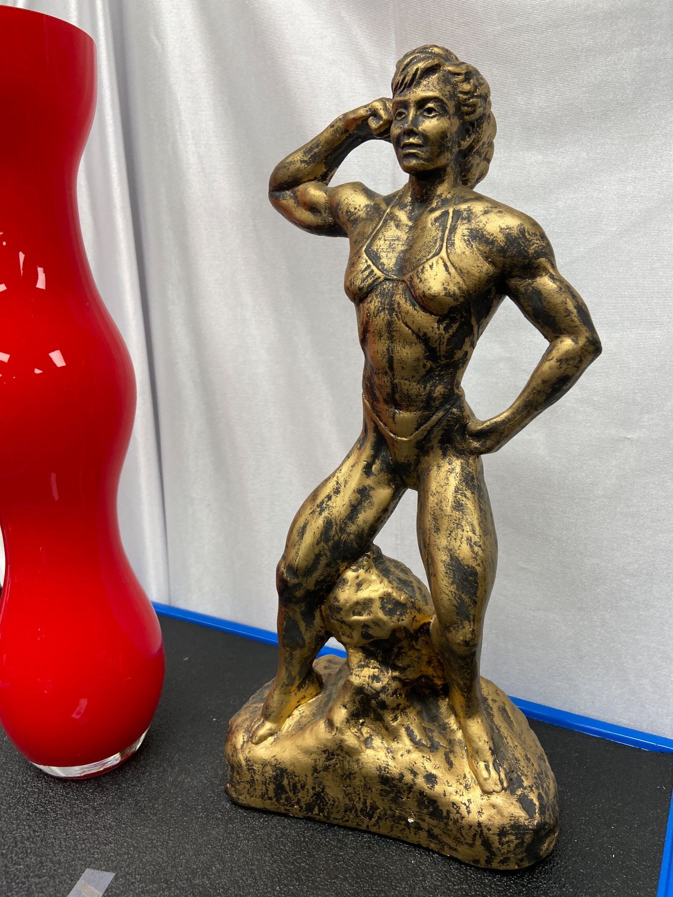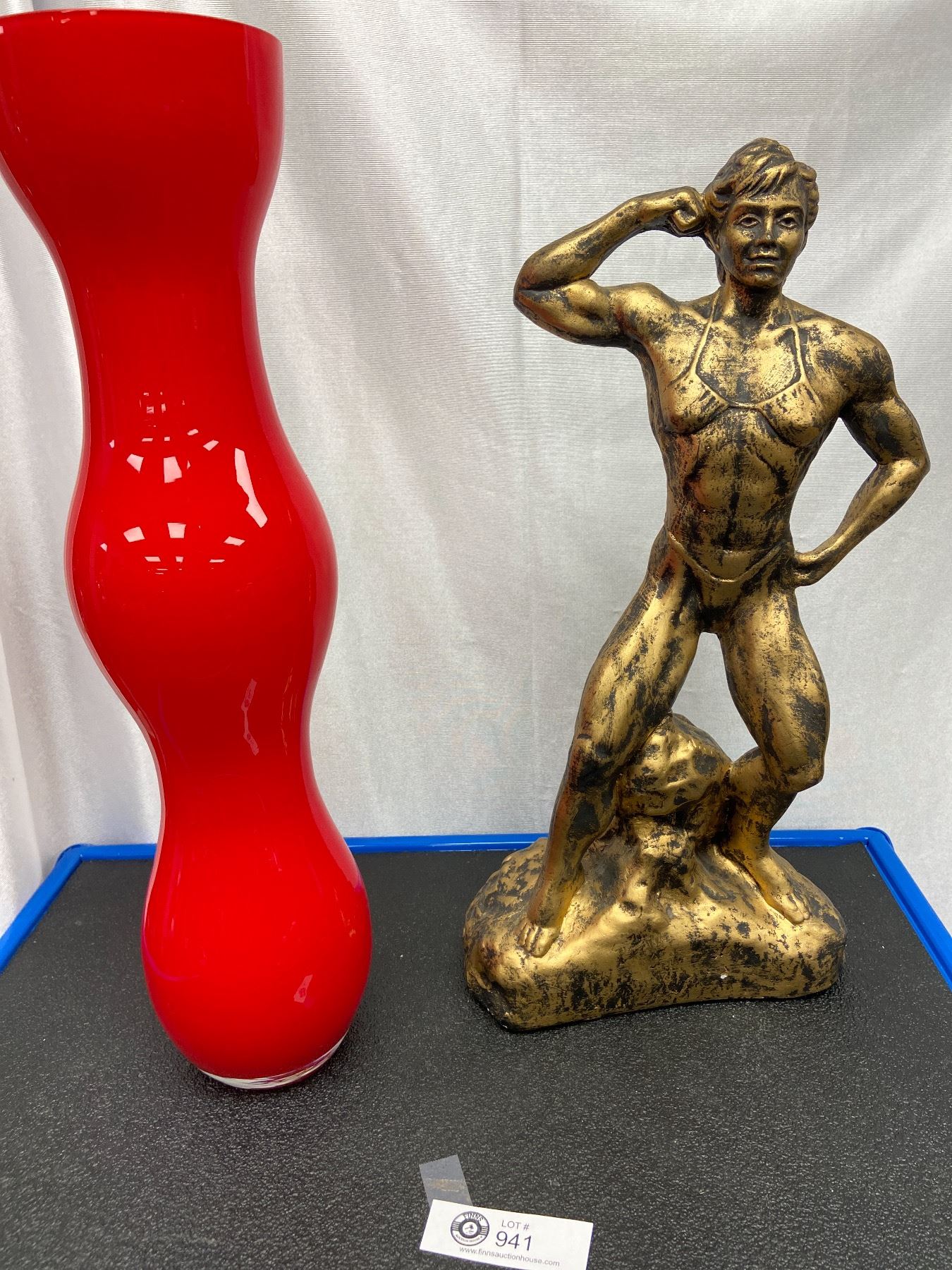 Vintage 19" Tall Woman Body Builder Statue + 19" H Red Vase
