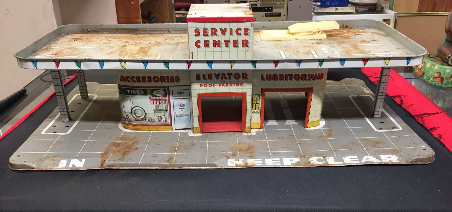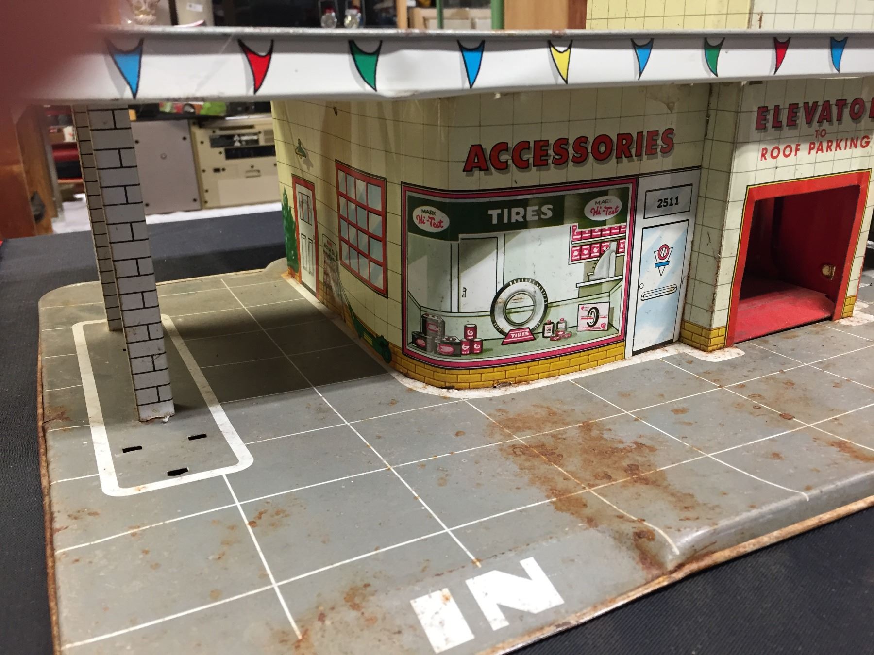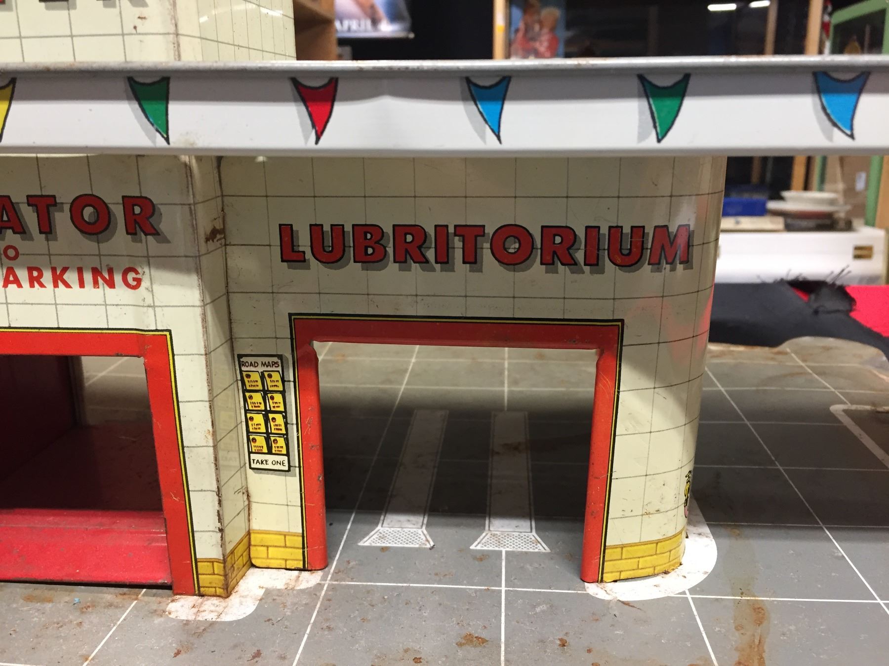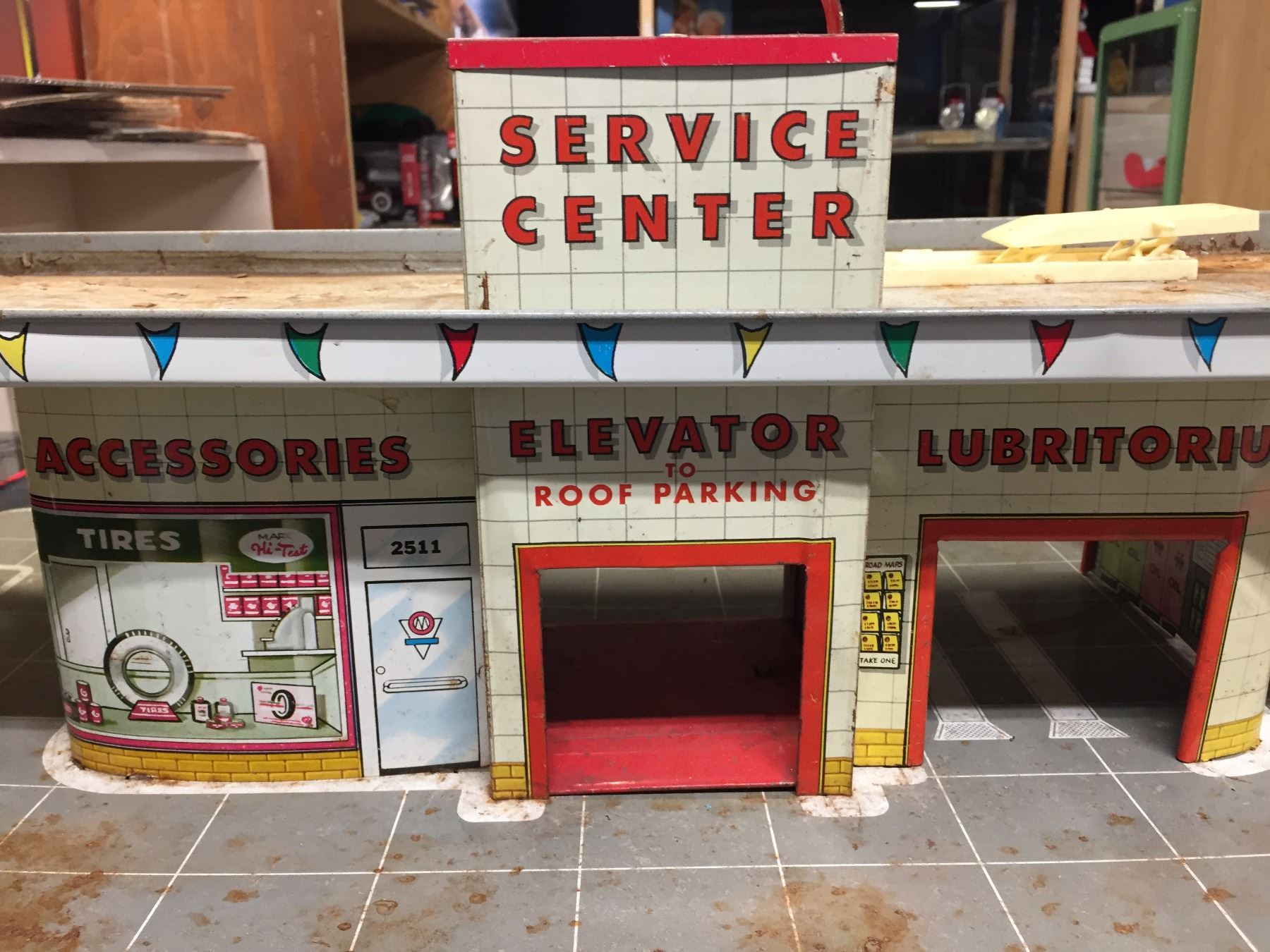 Vintage 1950’s Tin Litho Marx Service Gas Station Lubrication Center. Has Evelvator for Roof top Service 26.5 w x 9 H x 15 D