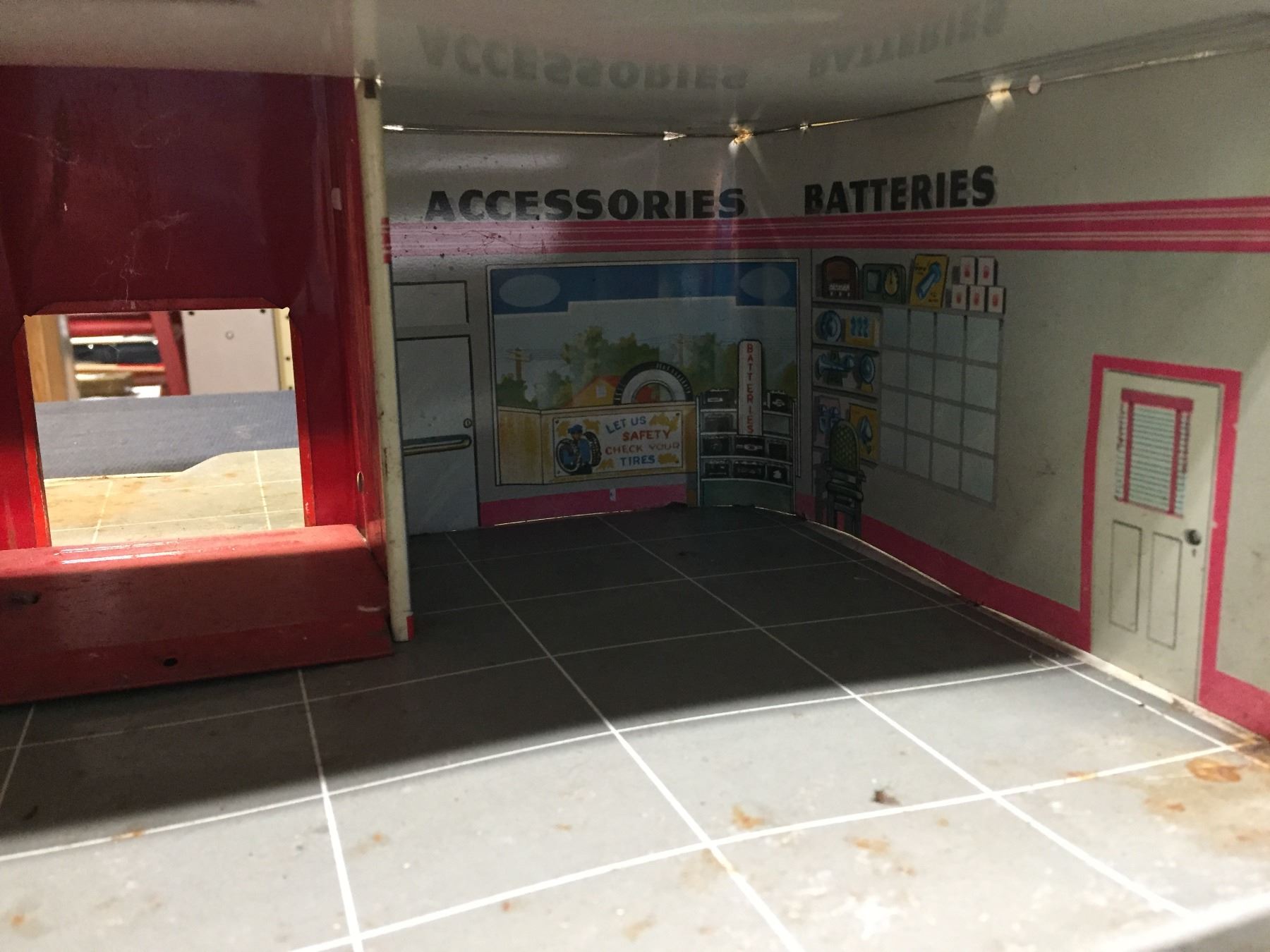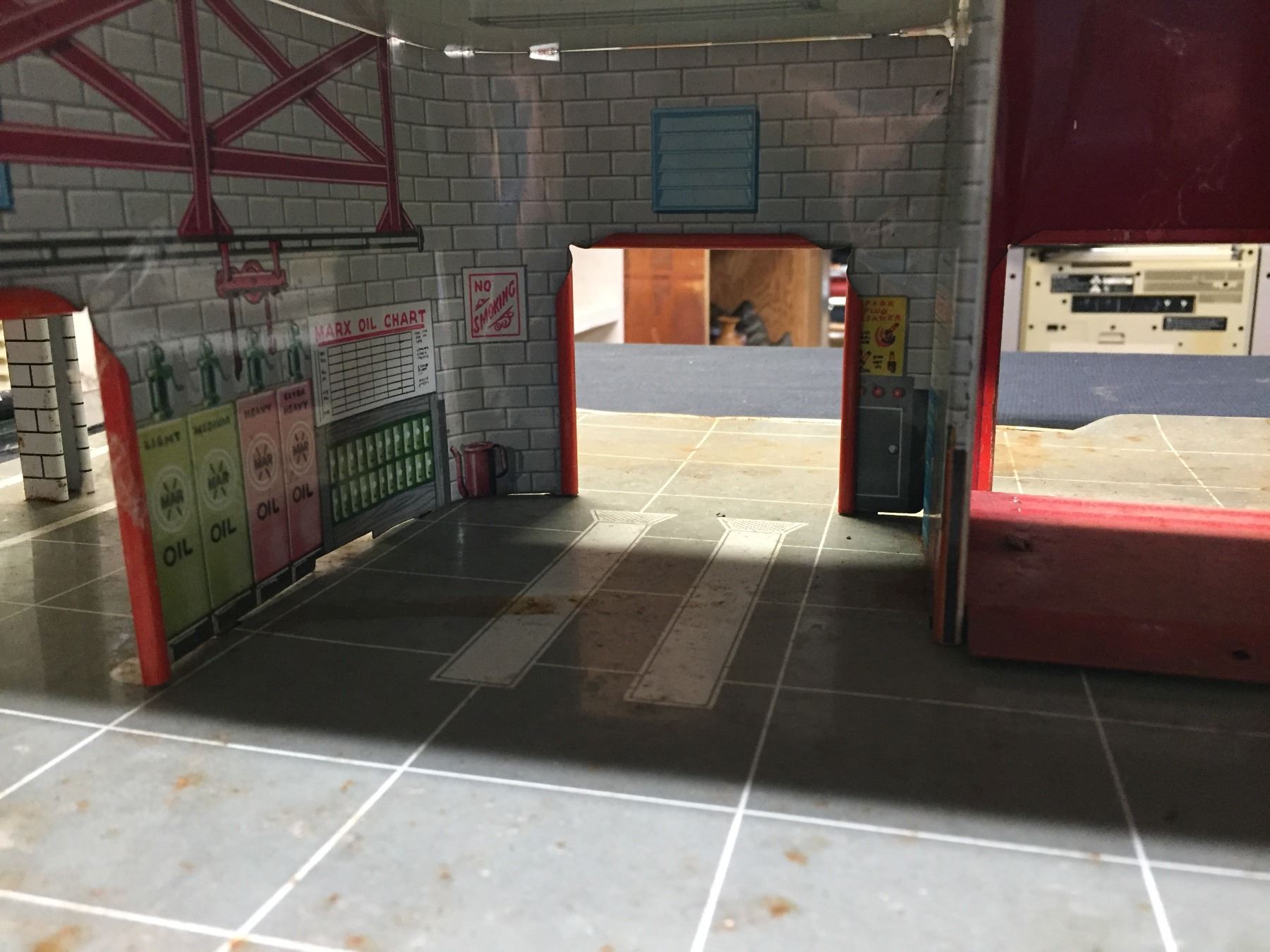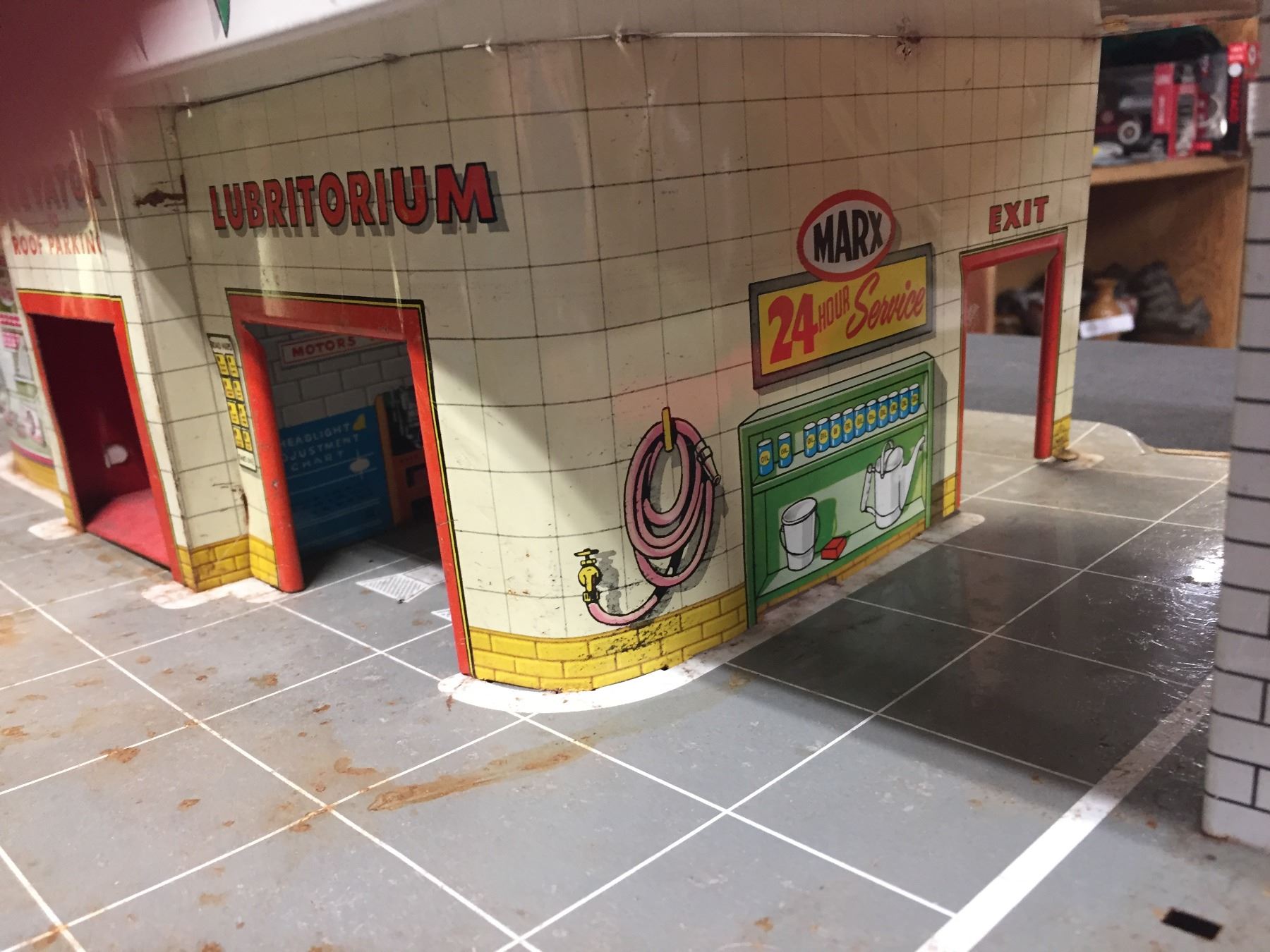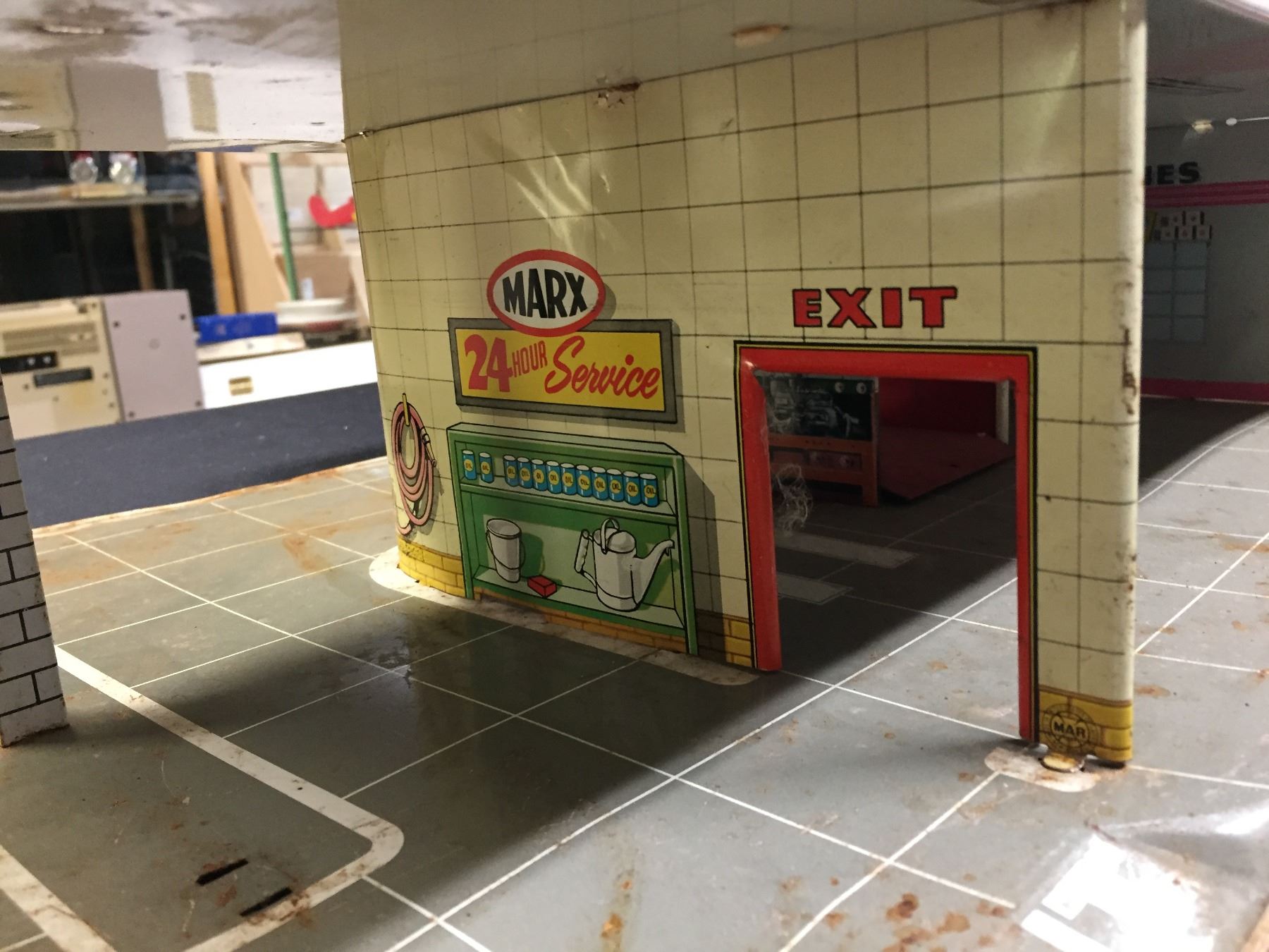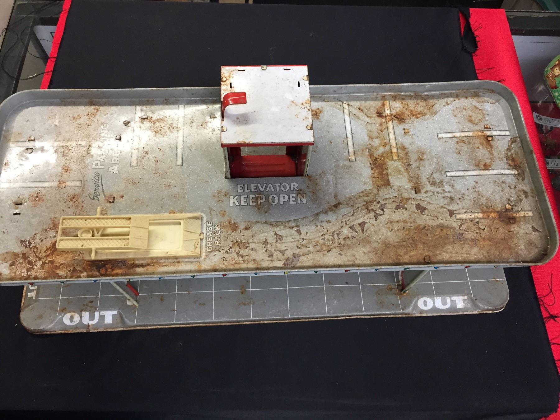 Vintage 1950’s Tin Litho Marx Service Gas Station Lubrication Center. Has Evelvator for Roof top Service 26.5 w x 9 H x 15 D