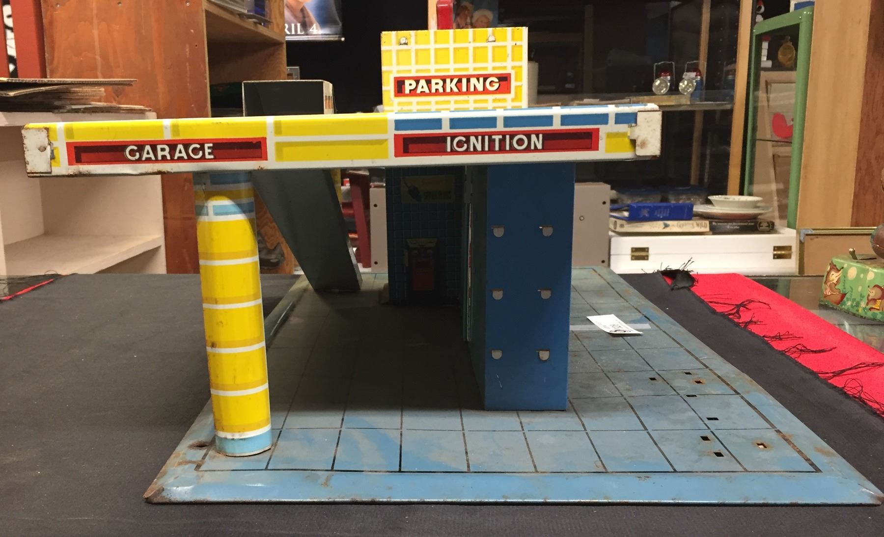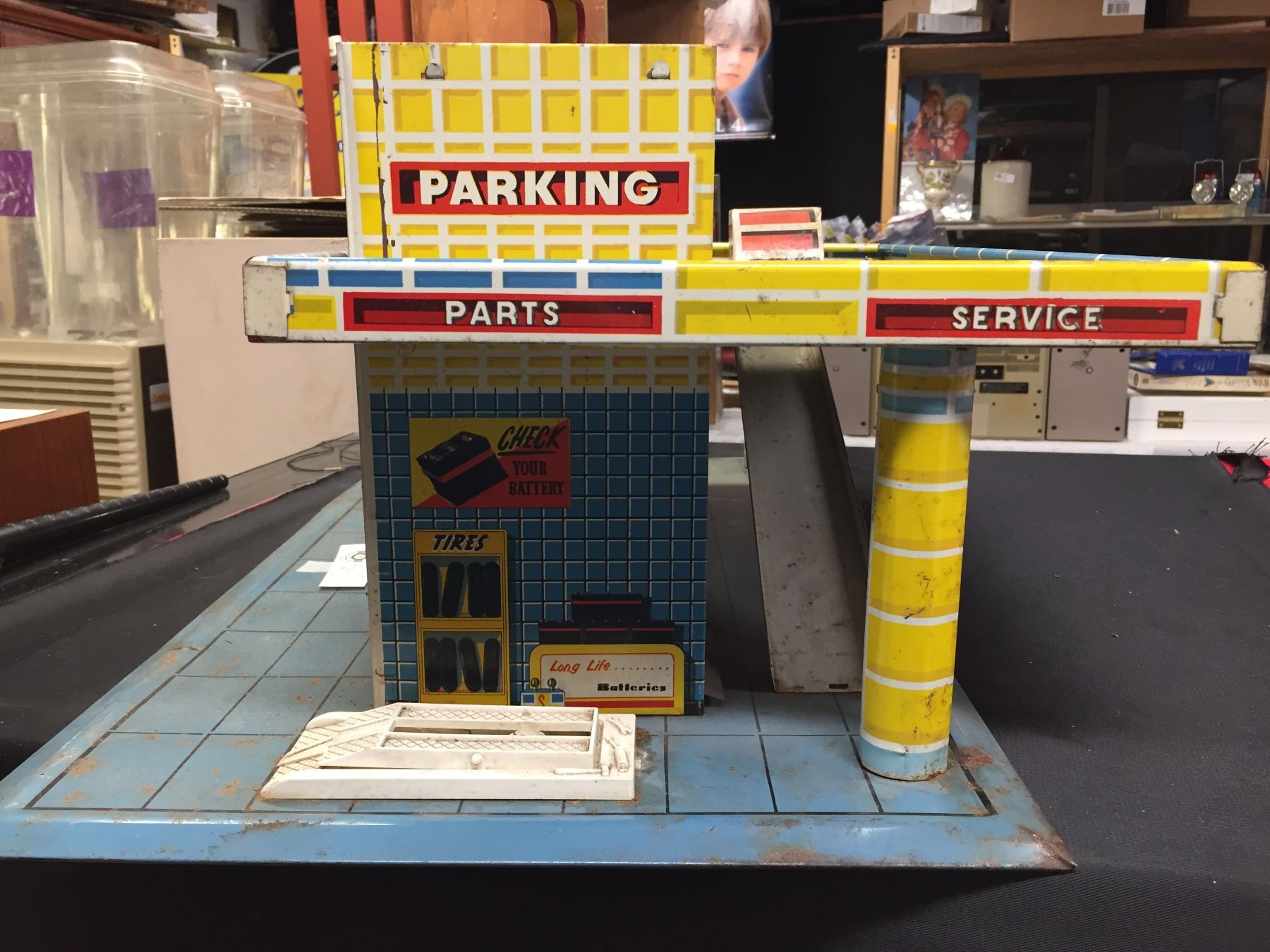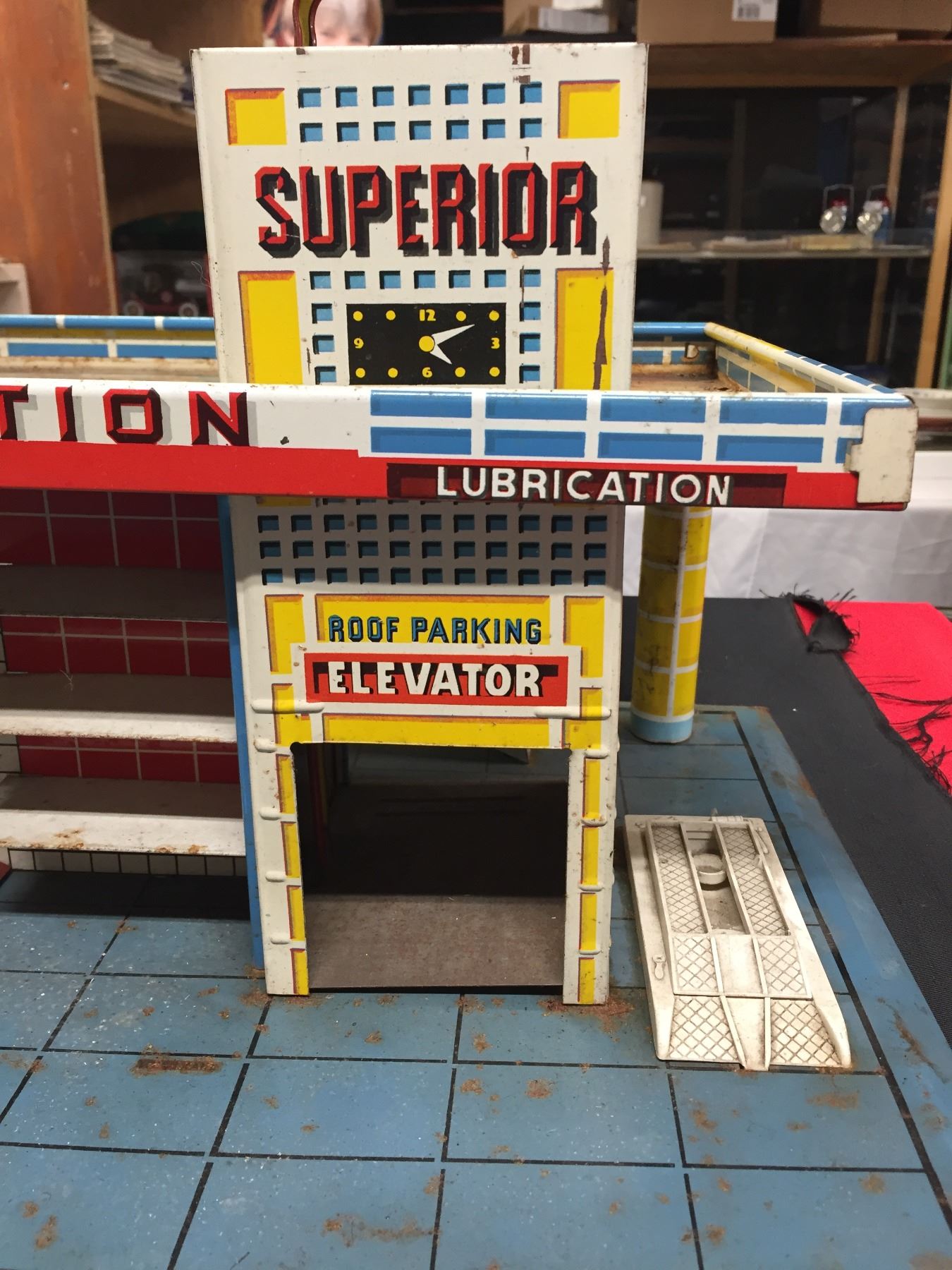 Vintage 1950’s Tin Litho Marx Service Station Center. Elevator for Roof Top Park 25 w x 12 H x 15 D